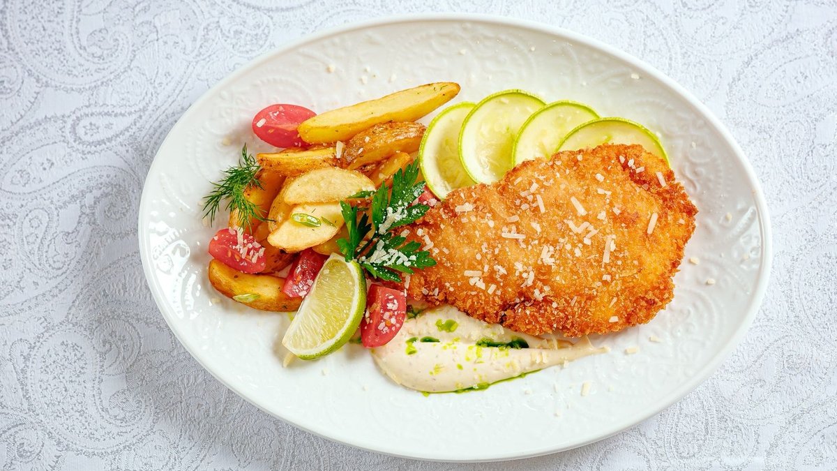 С куриной котлетой на огне, сыром и сочными овощами, подаётся с домашними чипсами