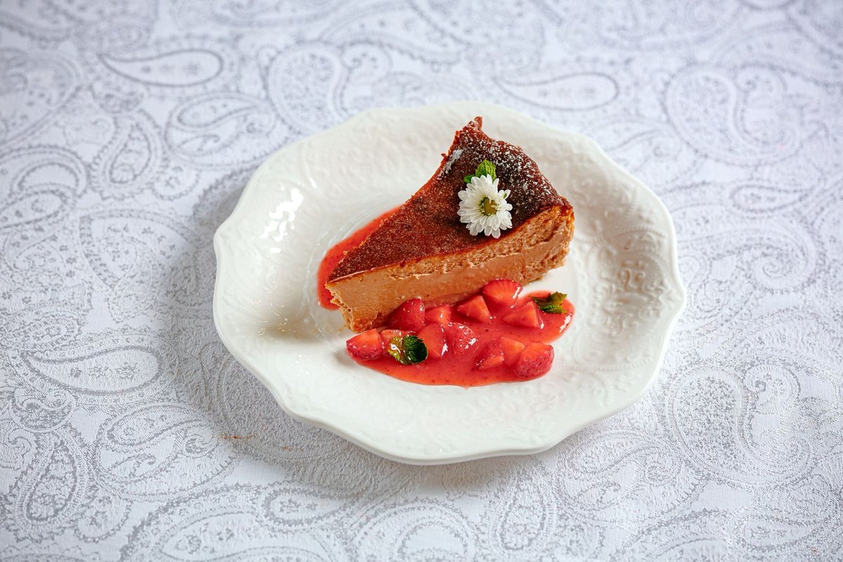 Легендарный чизкейк с карамельной корочкой и нежной текстурой внутри. Подается с клубничным конфитюром