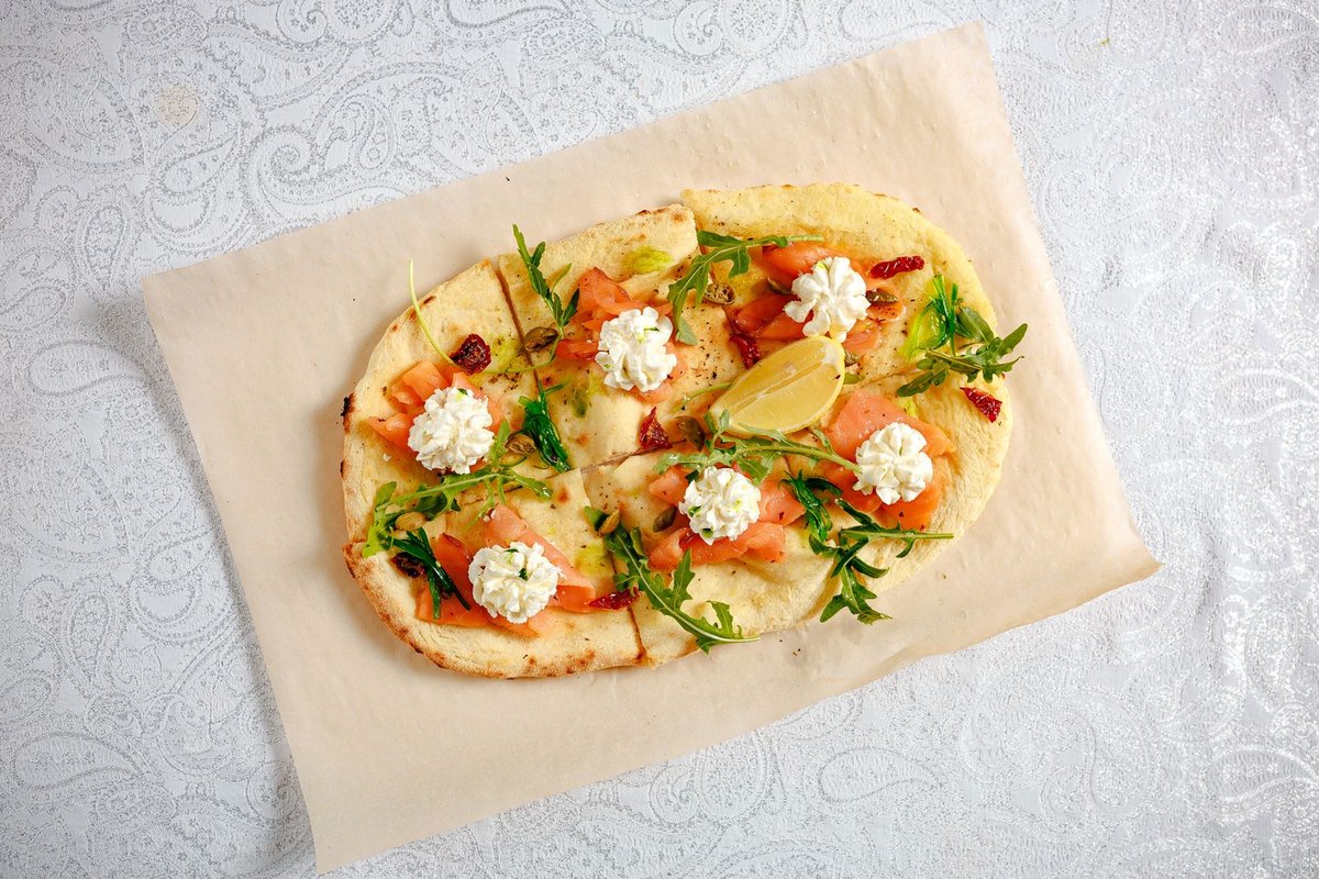 Малосольная семга, киноа и авокадо с микс салатом, томатным соусом Гамандари