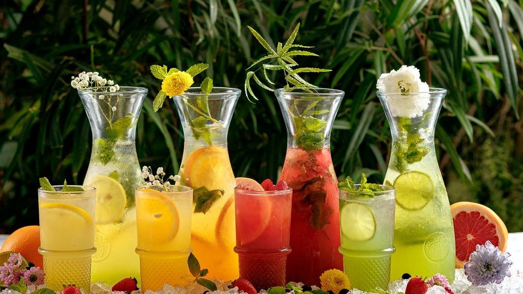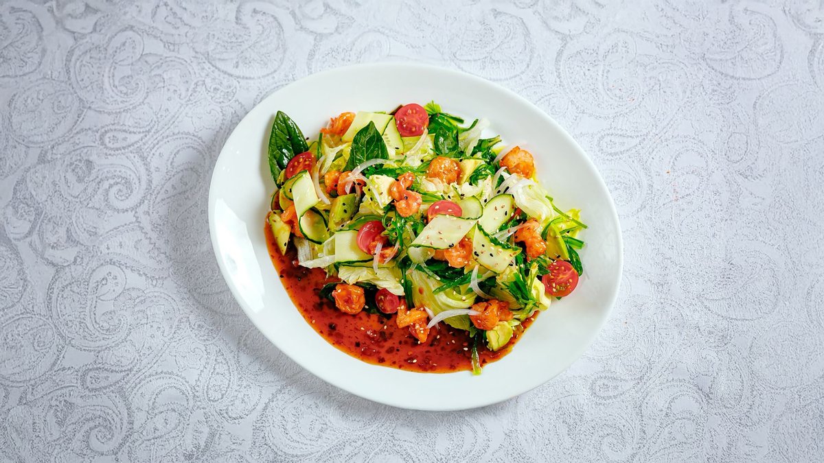 Конина обжаренная в соево-имбирном соусе, микс салата в йогуртовой заправке, томаты черри, перепелиные яйца, свежие огурчики, красный лук, кабачки в кляре