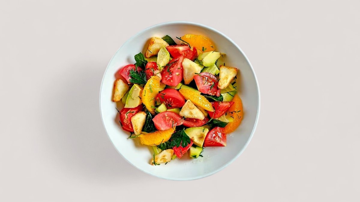 Свежие томаты, огурцы, авокадо, апельсин и зелень в лёгкой заправке, с тёплым обжаренным сыром халуми. Сочно, ярко, полезно