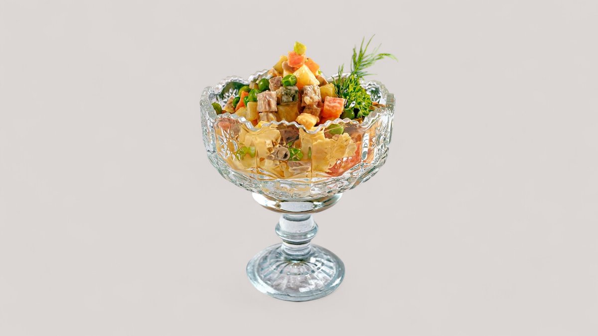 Наш Оливье — вкус, знакомый каждому: овощи, нежное мясо, зелёный горошек и маринованные огурчики в традиционном соусе.