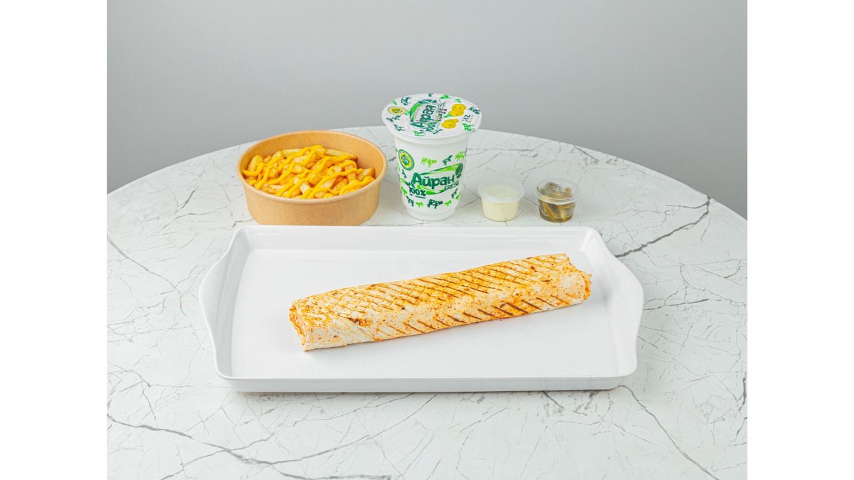 Куриное филе,картофель фри,белый соус,красный соус,огурцы,помидор,лаваш