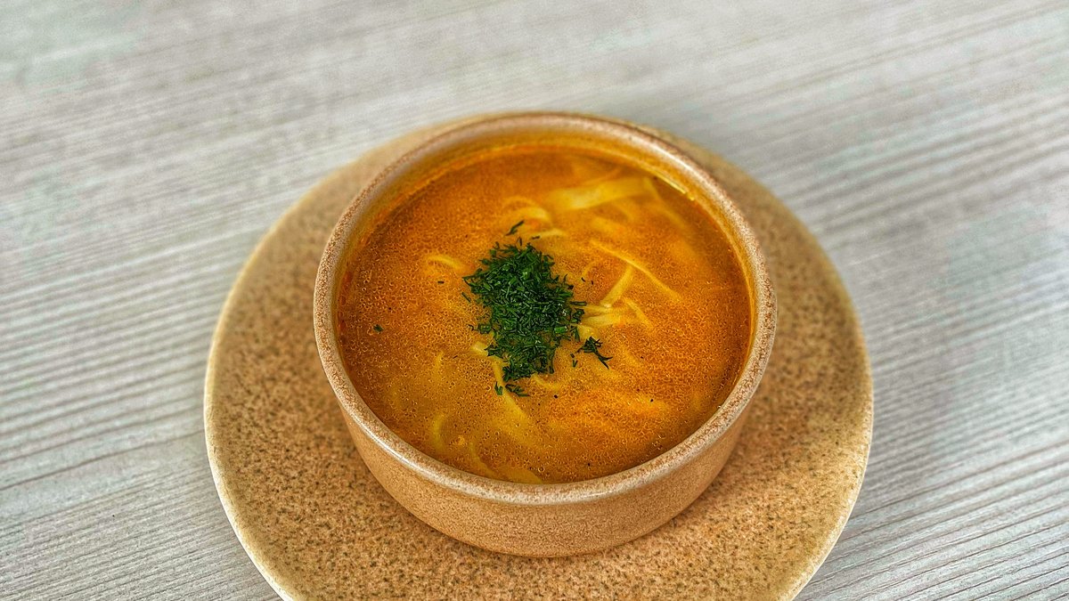 наваристый куринный бульон домашняя лапша, овощняя пассировкаи куринное филе