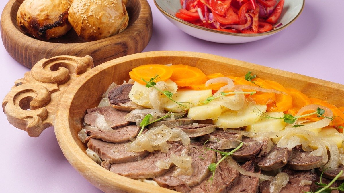 национальное блюдо с мясом конины, казы и жайя, тестом и картофелем