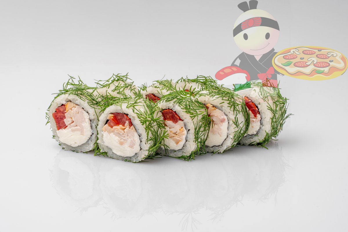Рис, нори, сливочный сыр, курица, помидор, укроп.