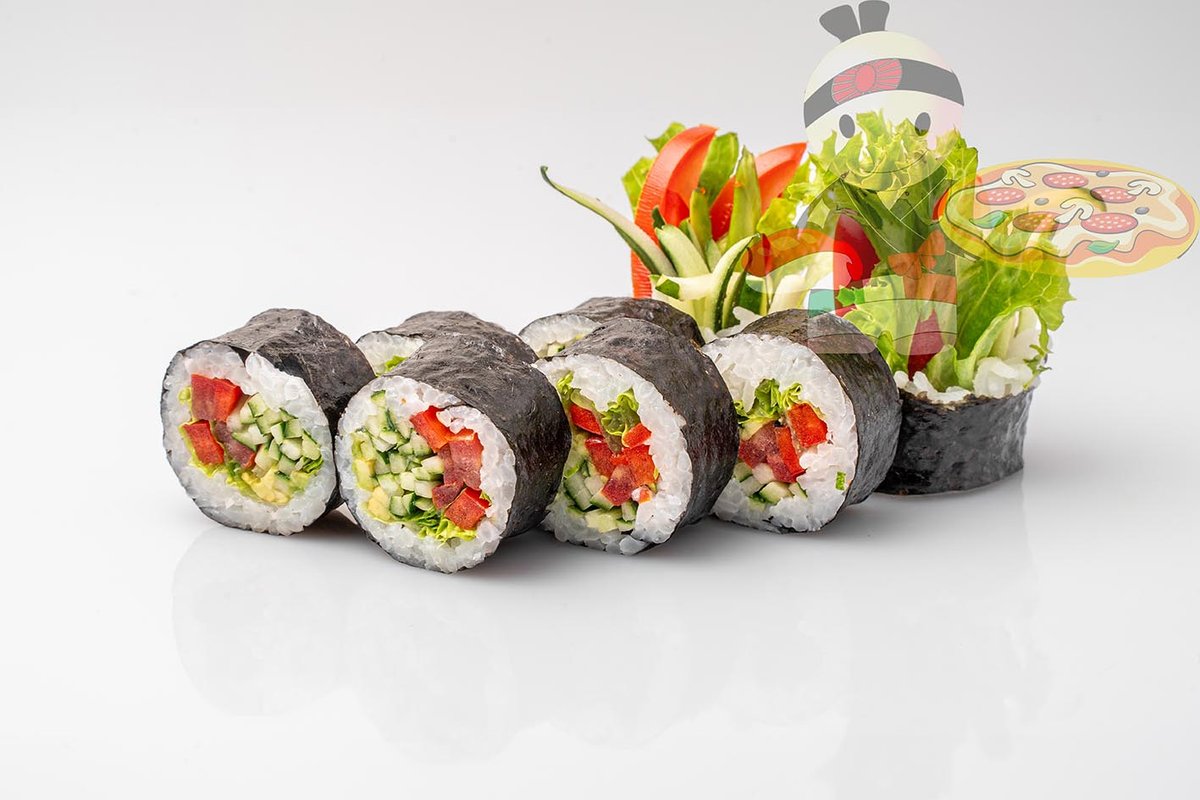 Рис, нори, паприка, лист салата, помидор, укроп