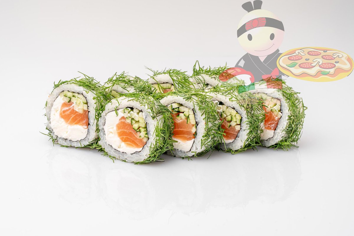 Рис, нори, сливочный сыр, лосось, огурец, укроп.