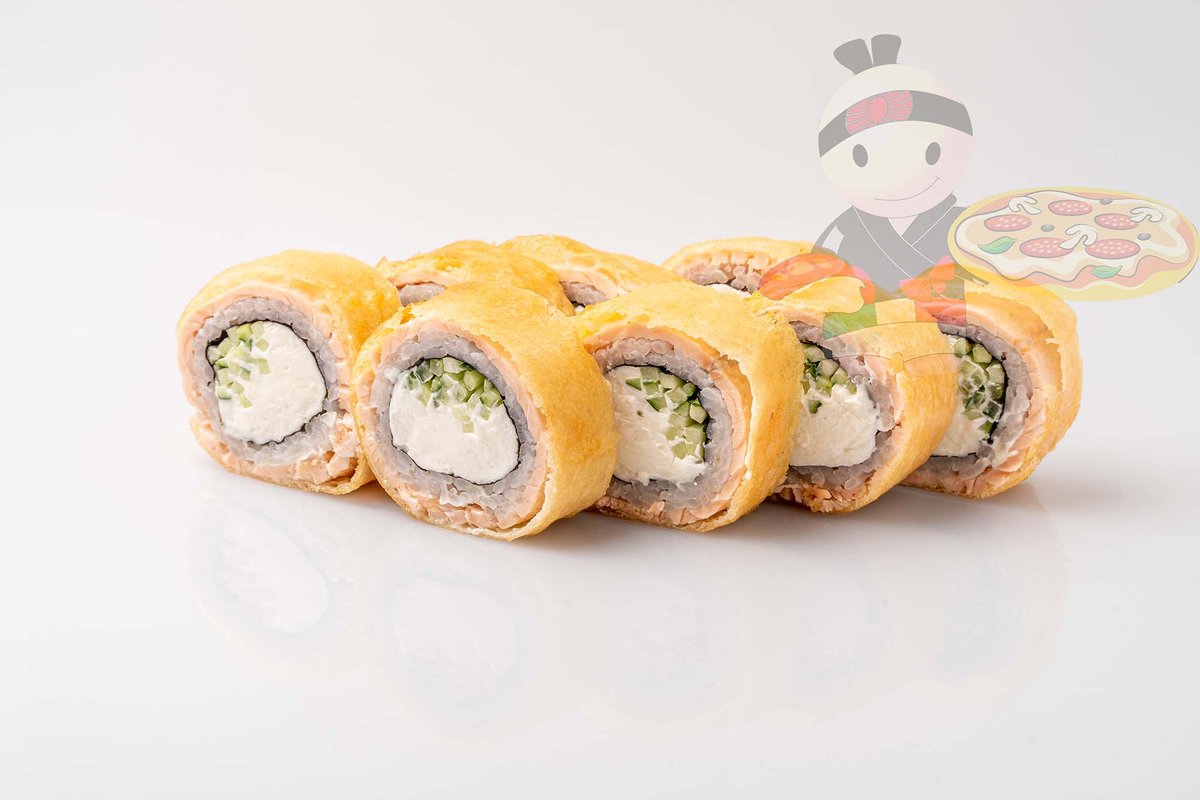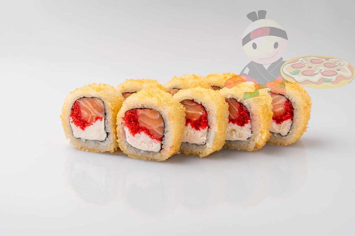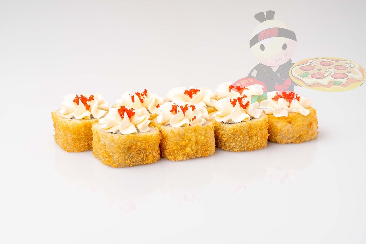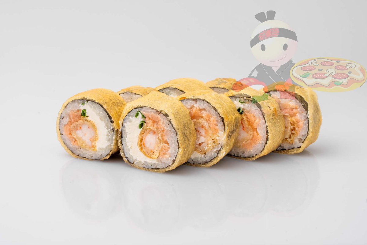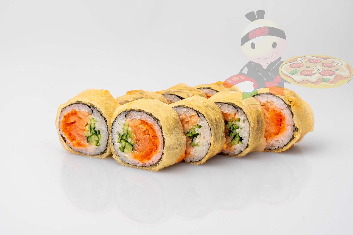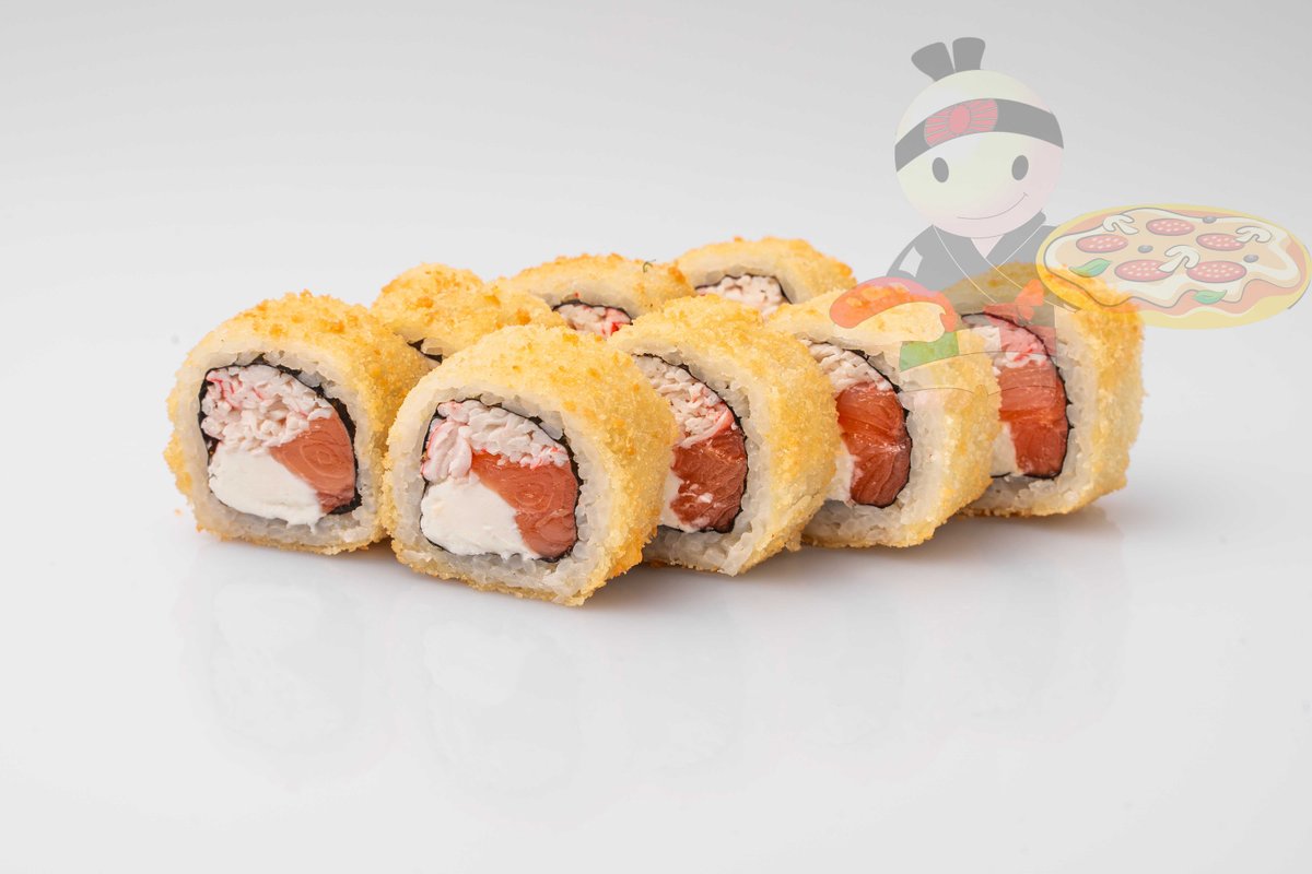 Рис, нори, креветка, лосось, огурец, сырный соус, тобико, сухари панко, кляр.