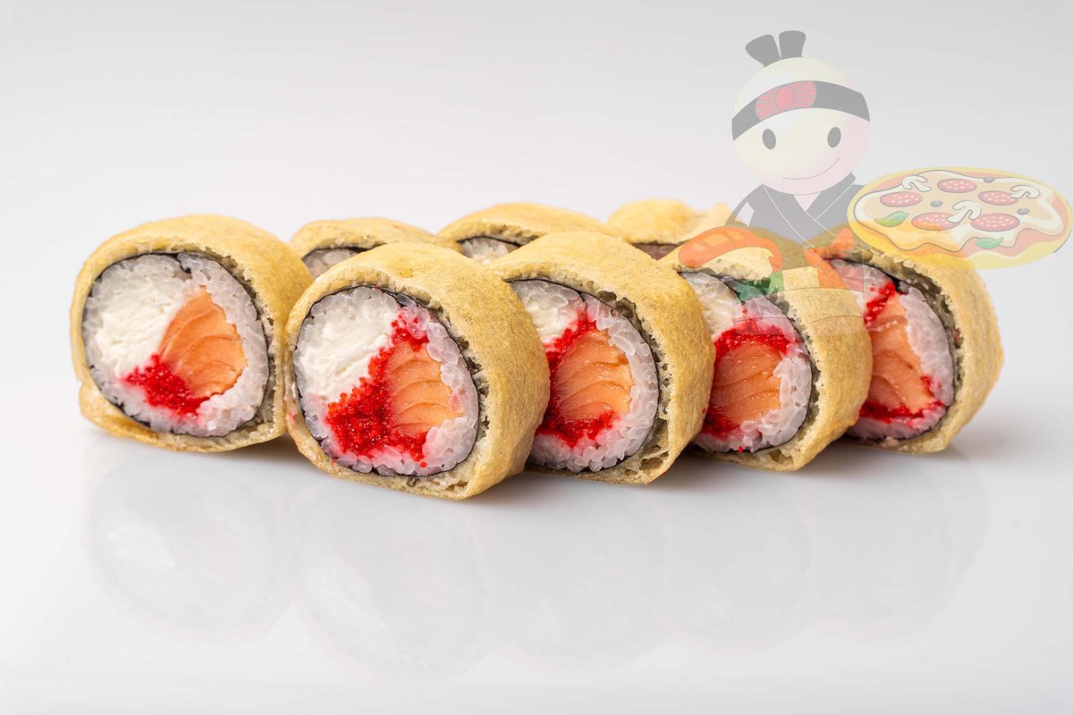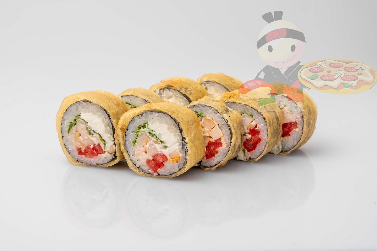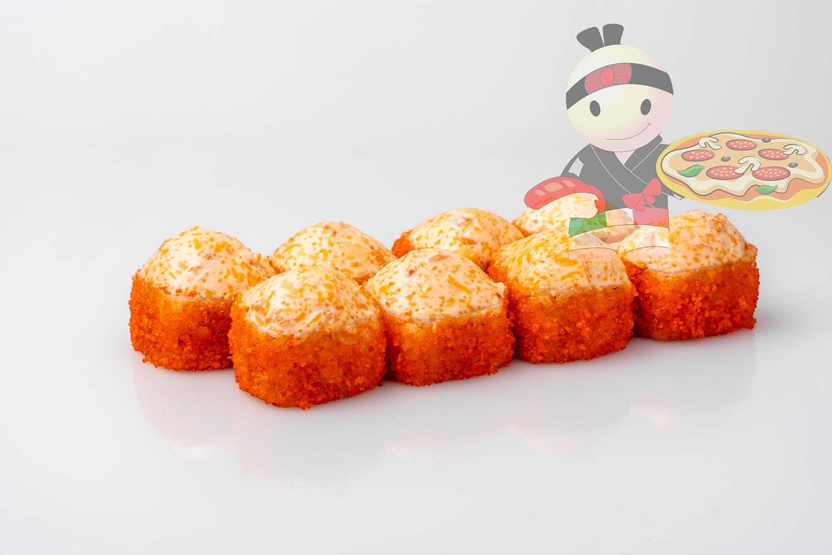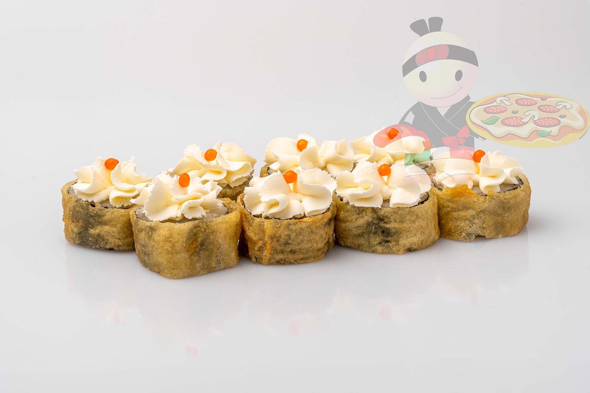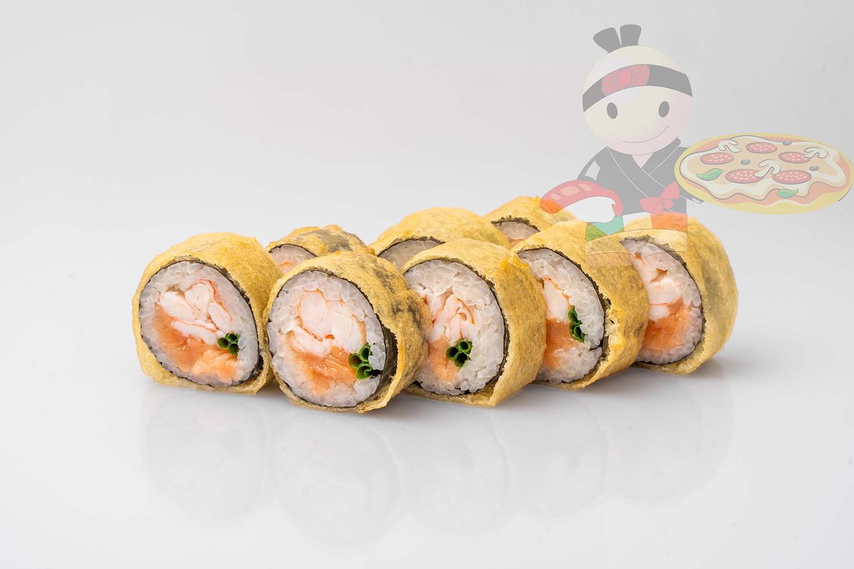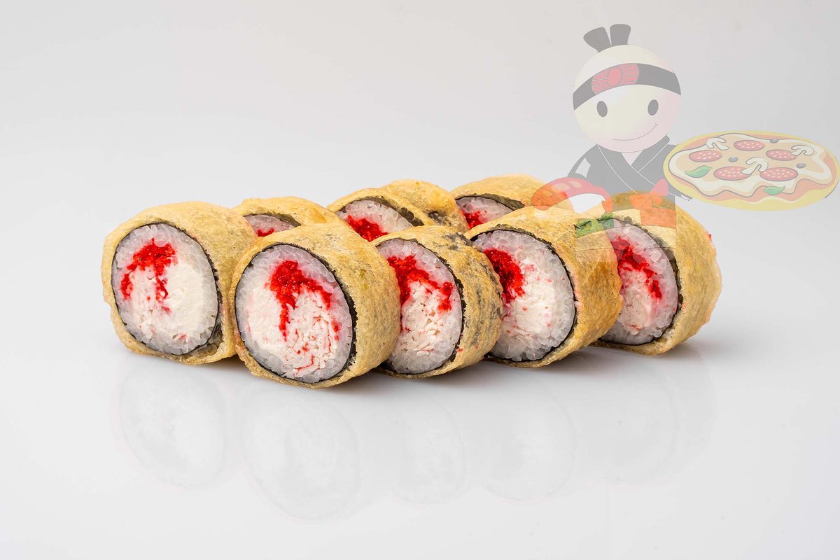 Рис, нори, креветка, лосось, огурец, сырный соус, тобико, сухари панко, кляр.