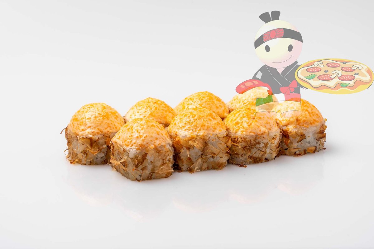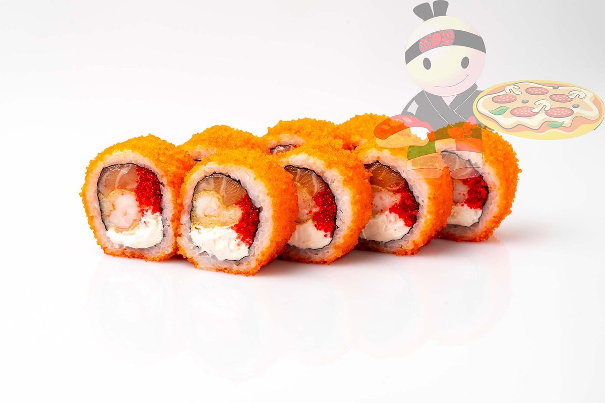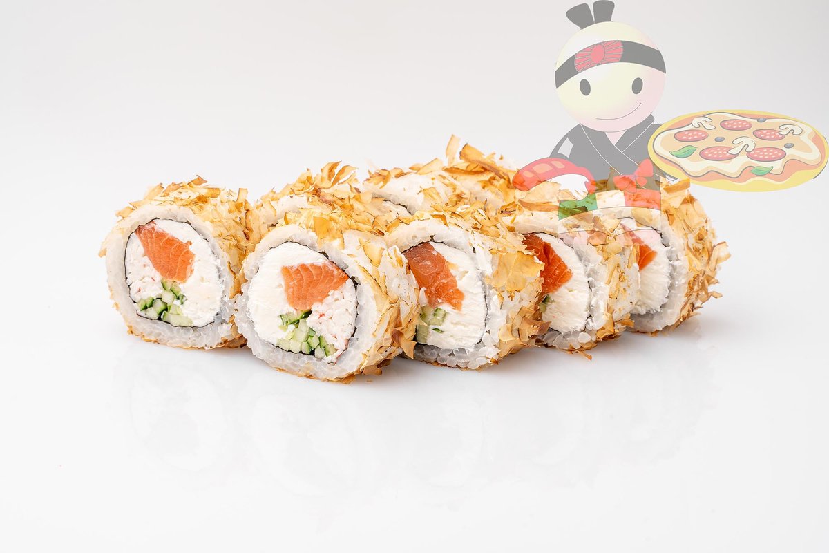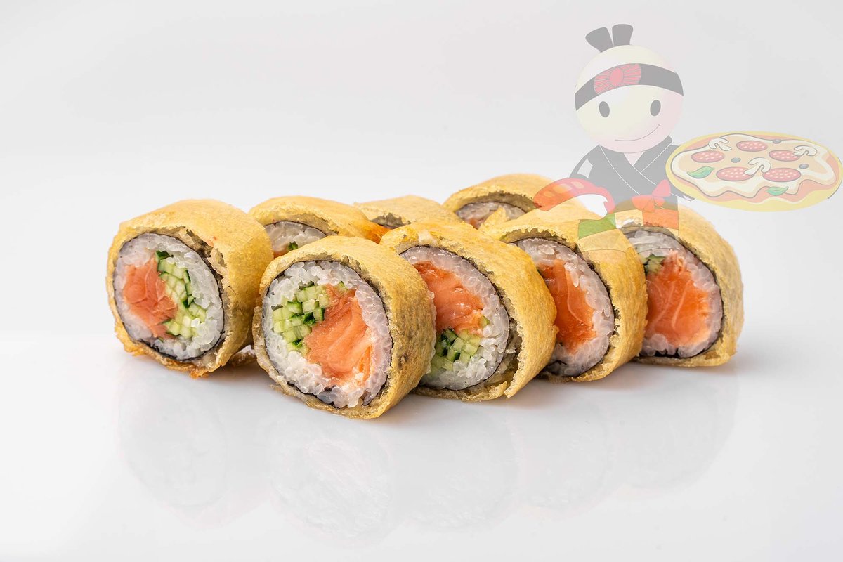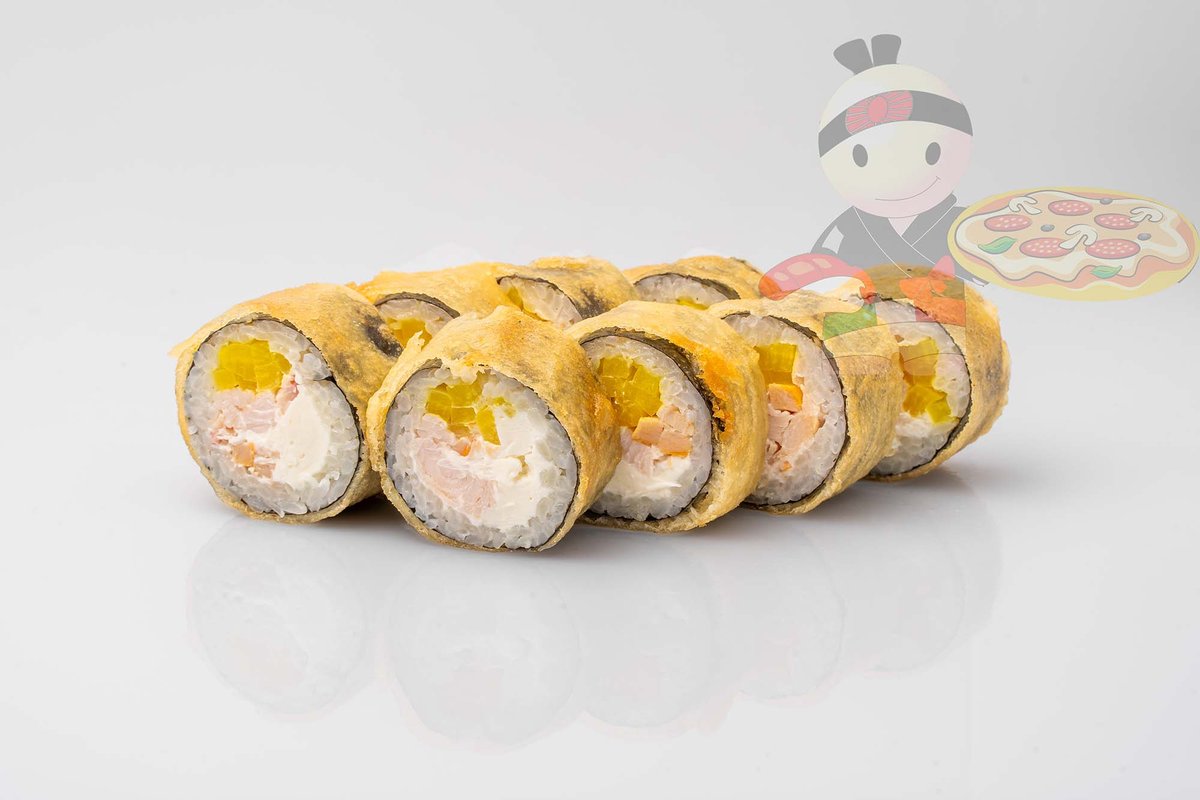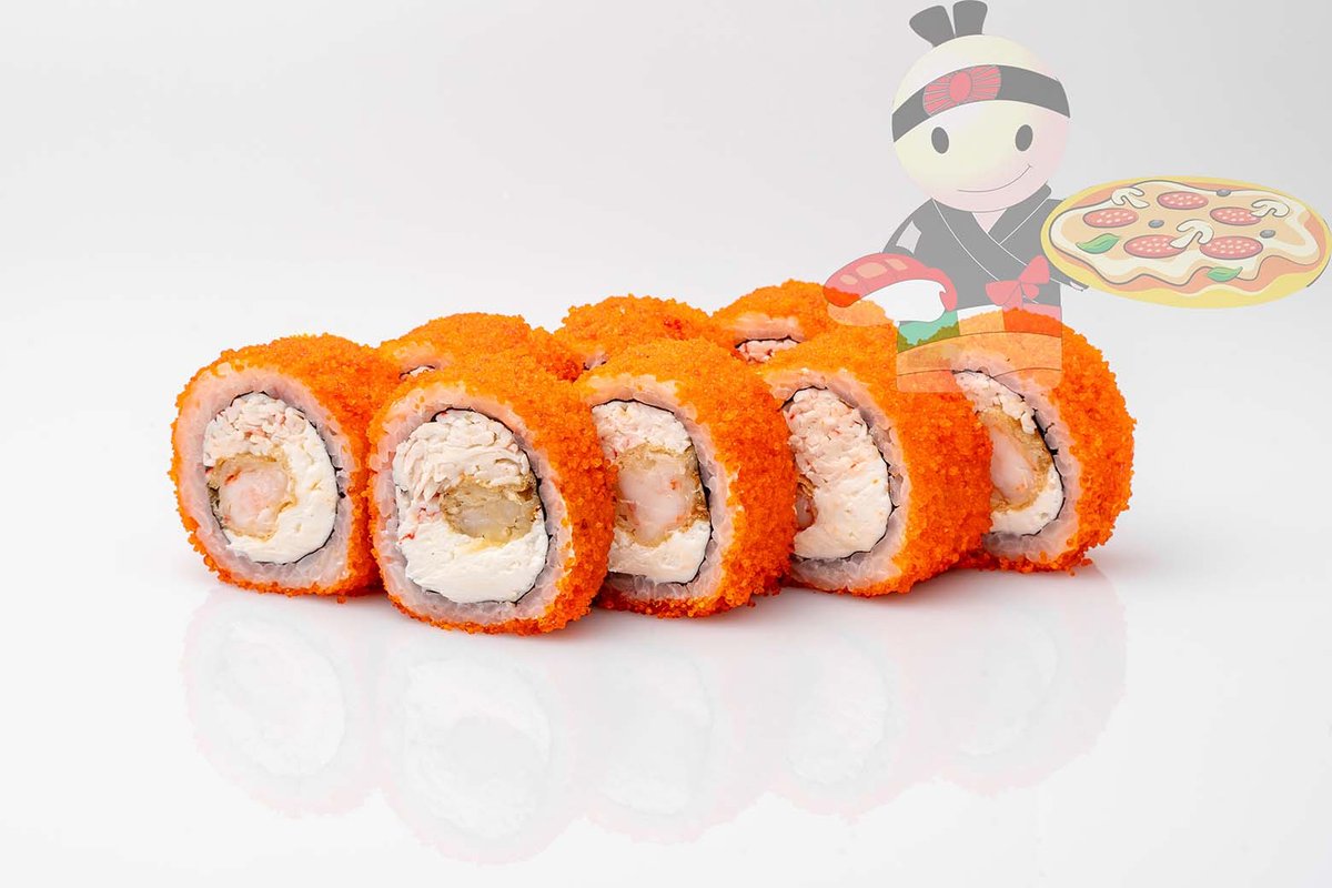 Рис, нори, креветка, лосось, огурец, сырный соус, тобико, сухари панко, кляр.