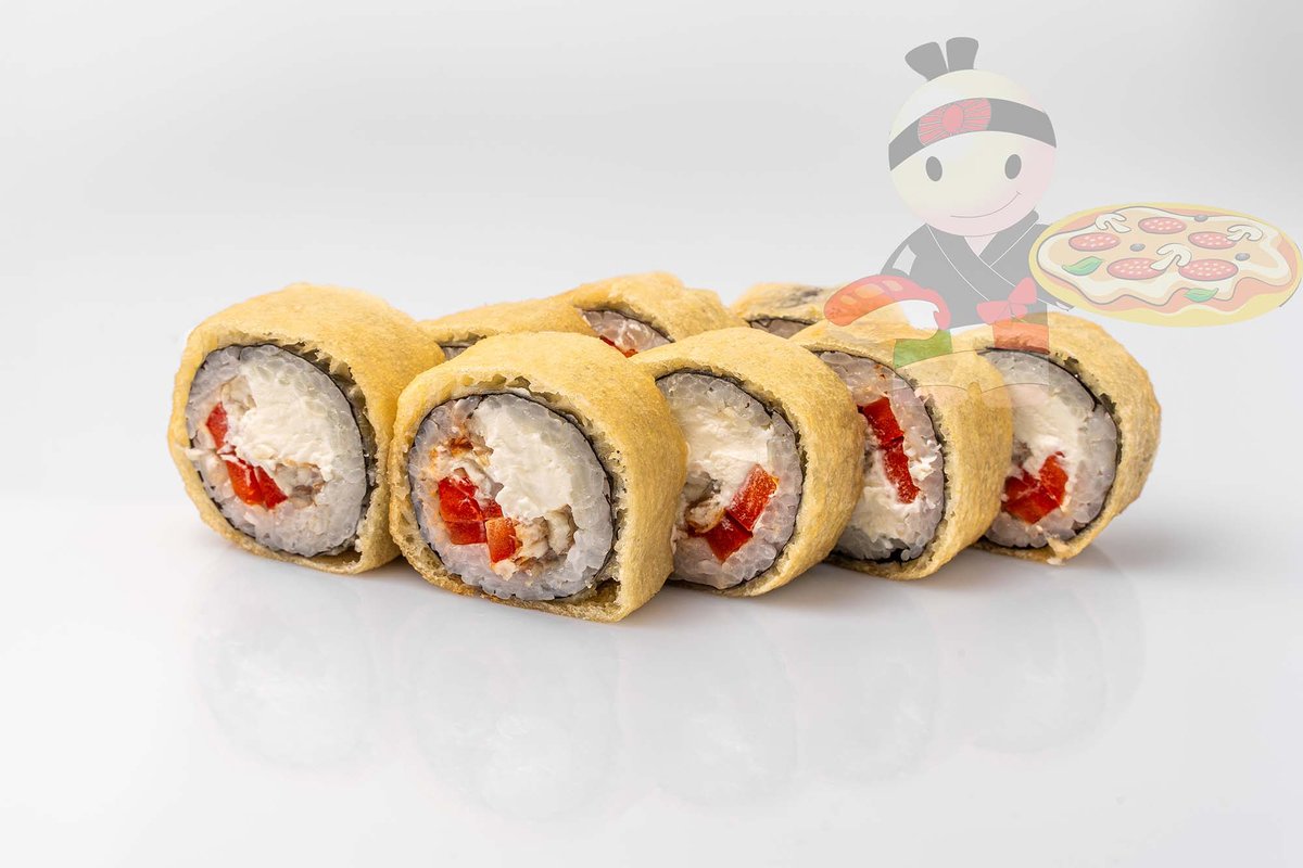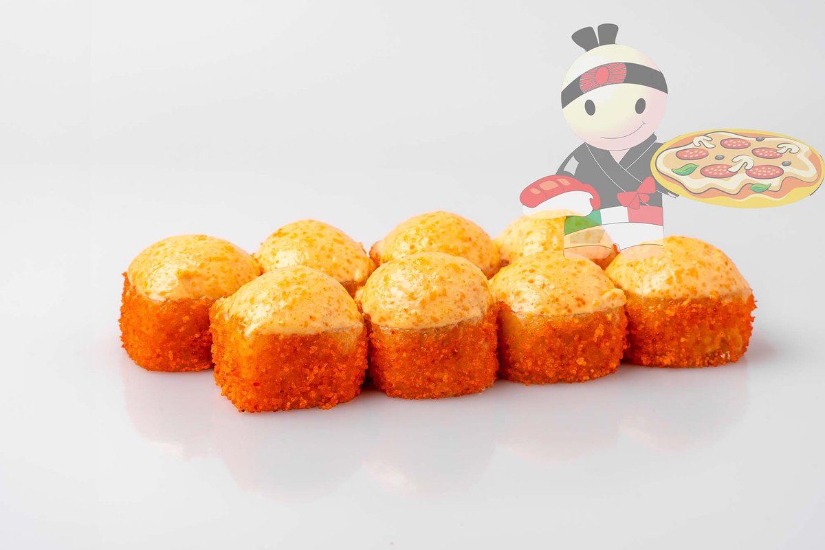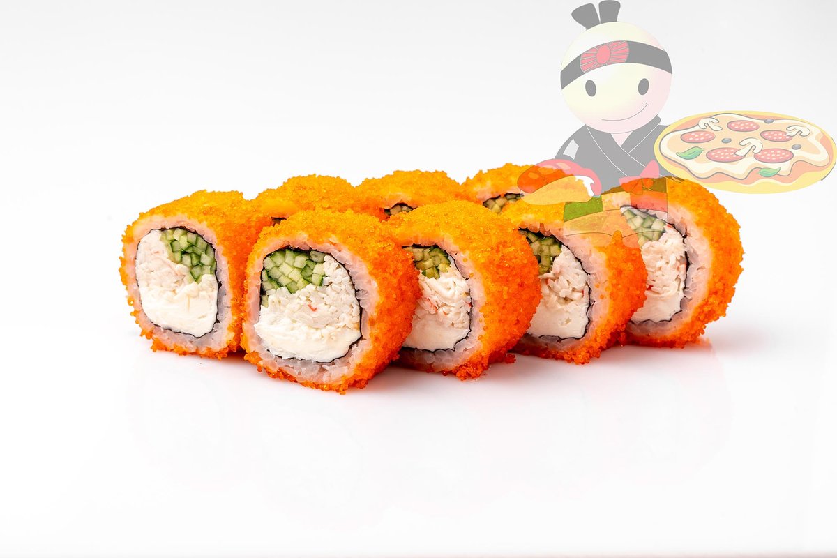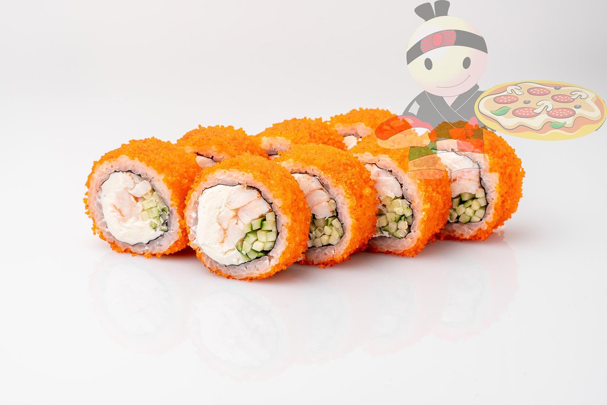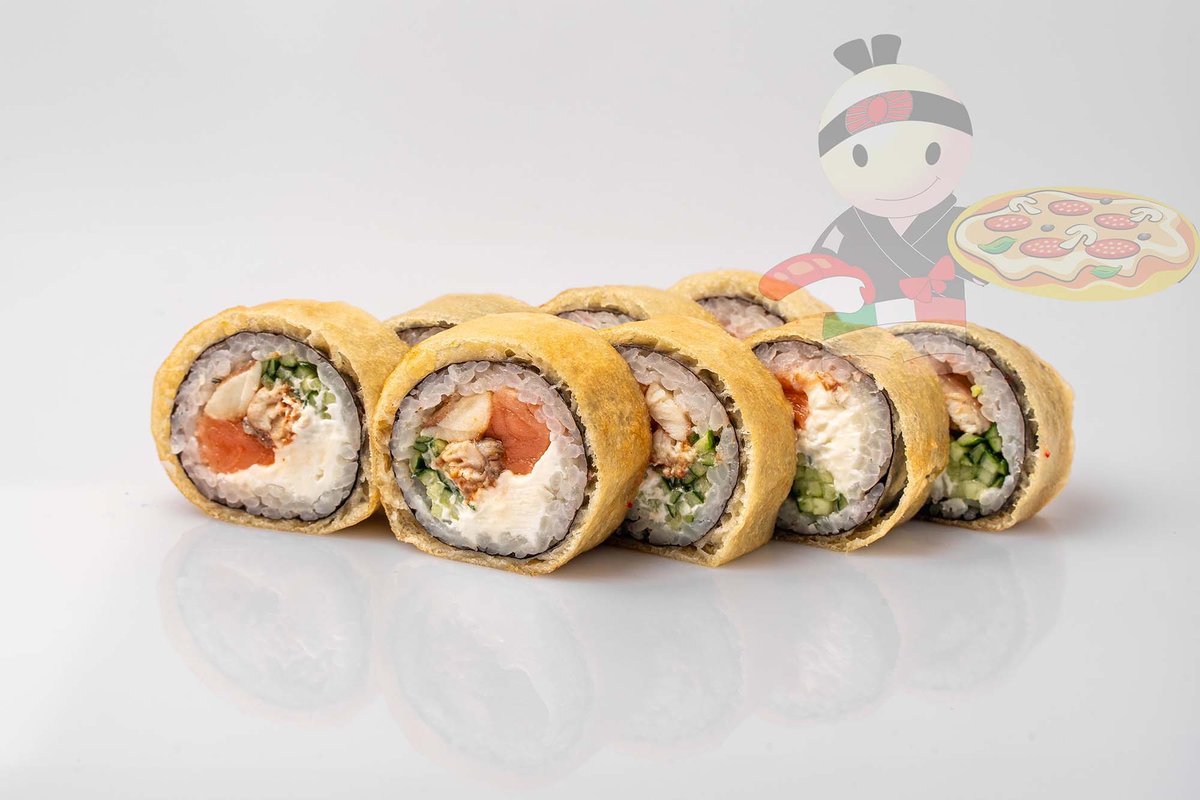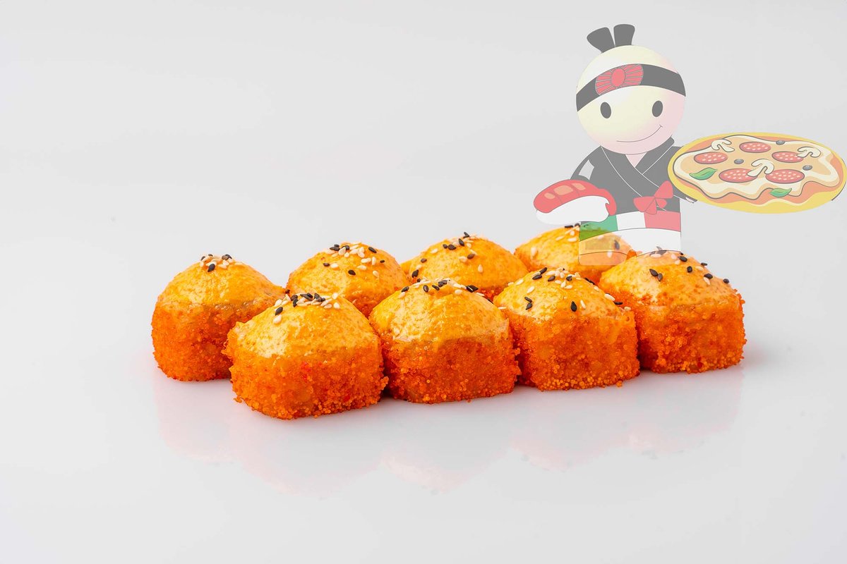 Рис, нори, креветка, лосось, огурец, сырный соус, тобико, сухари панко, кляр.