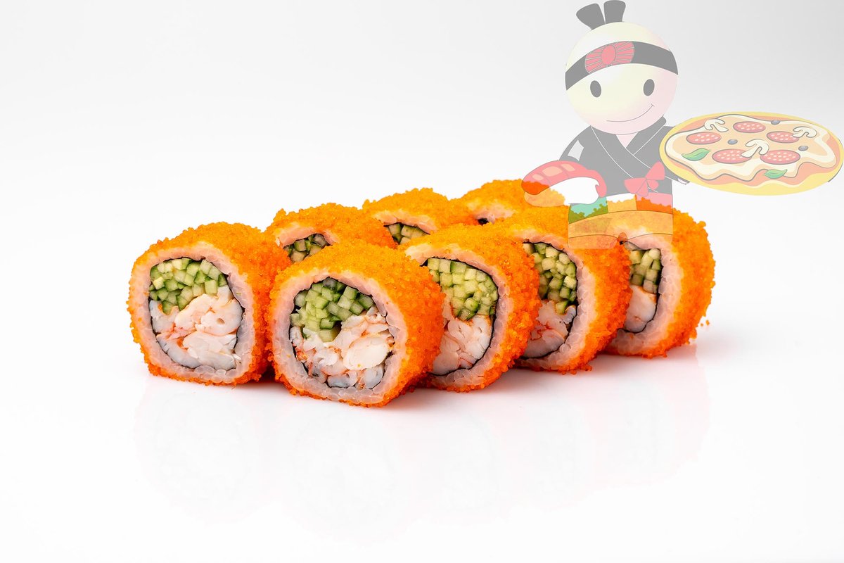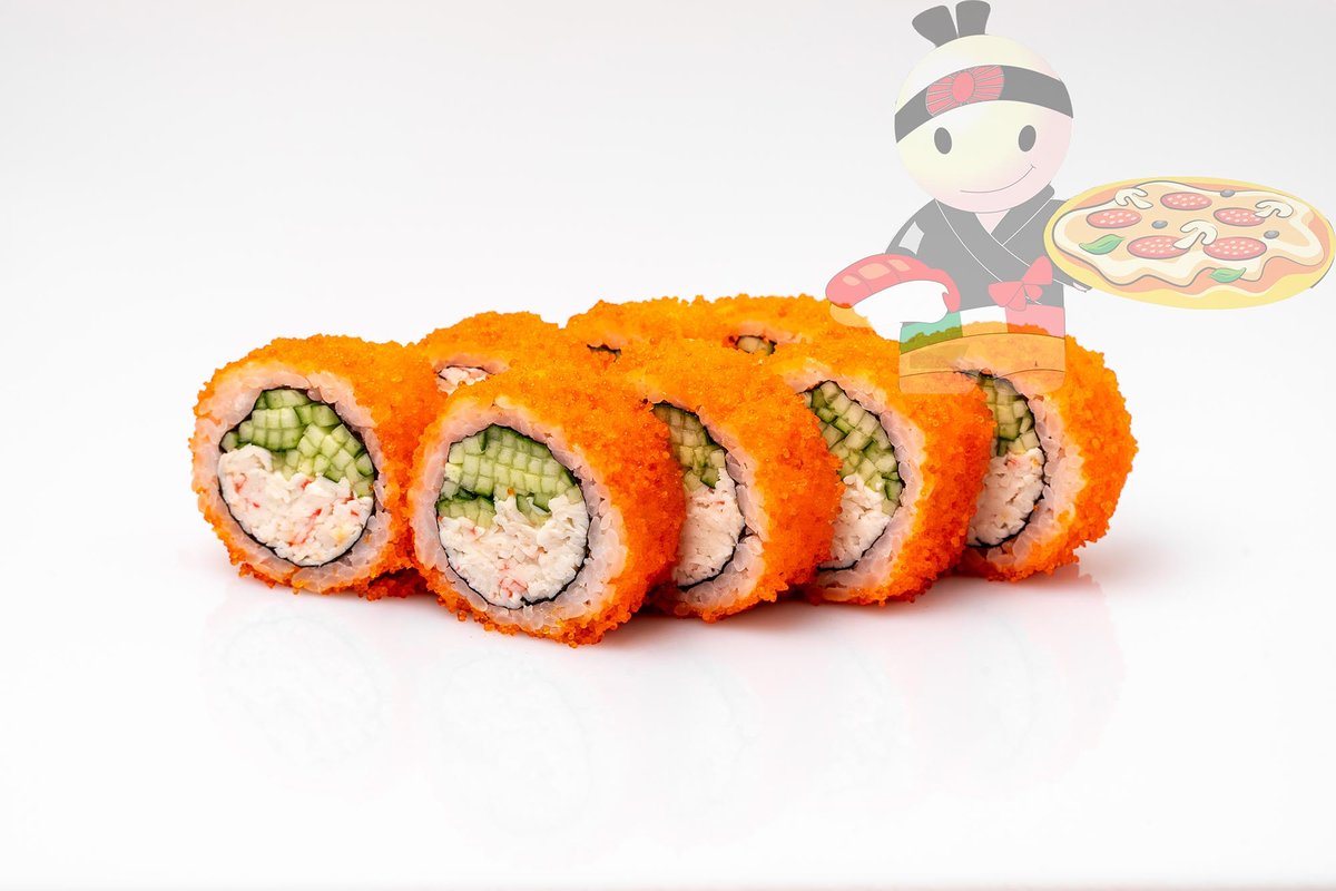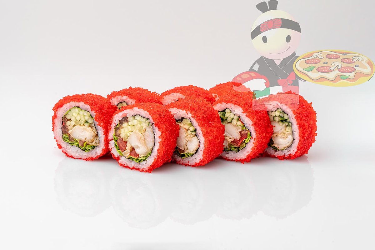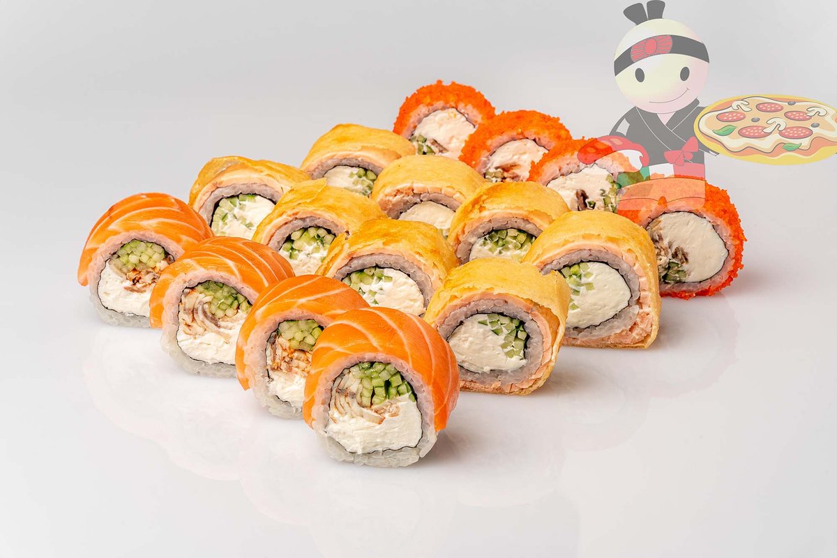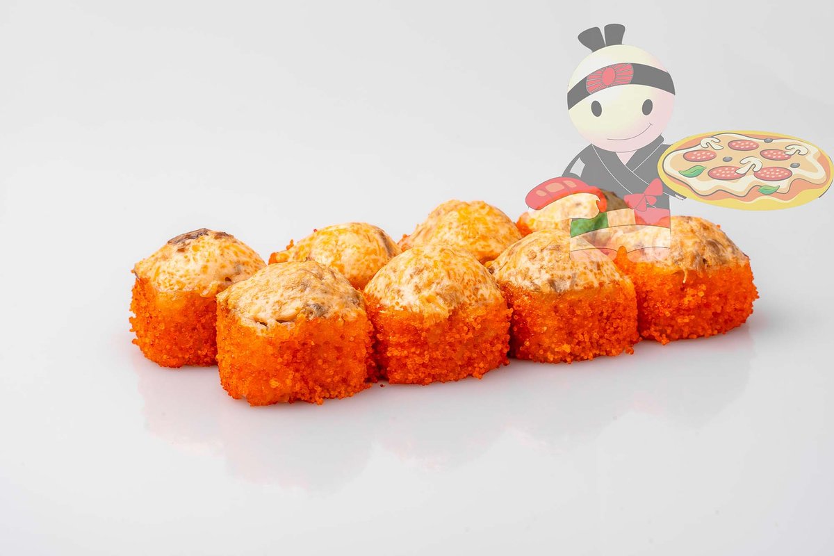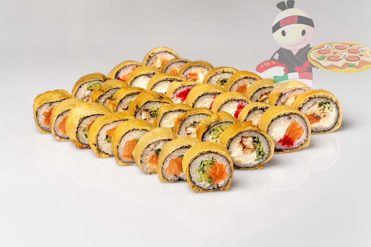 Рис, нори, креветка, лосось, огурец, сырный соус, тобико, сухари панко, кляр.