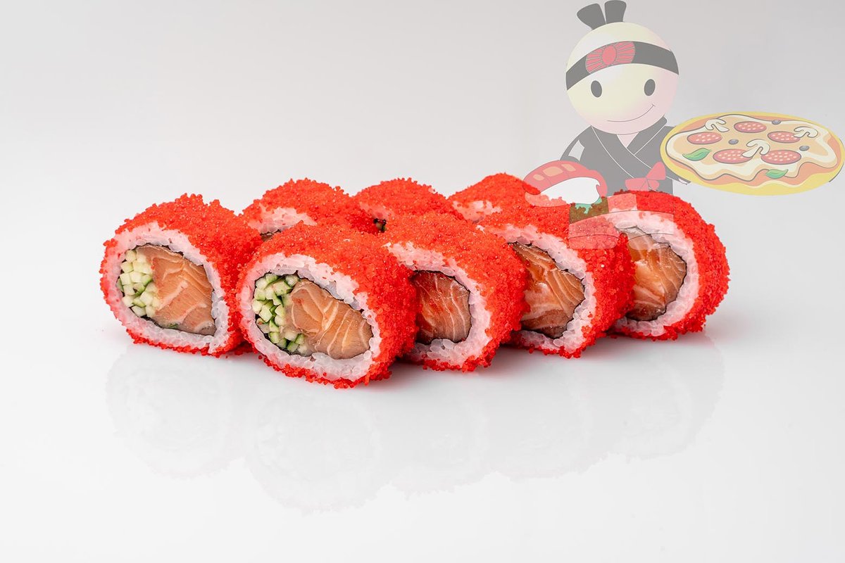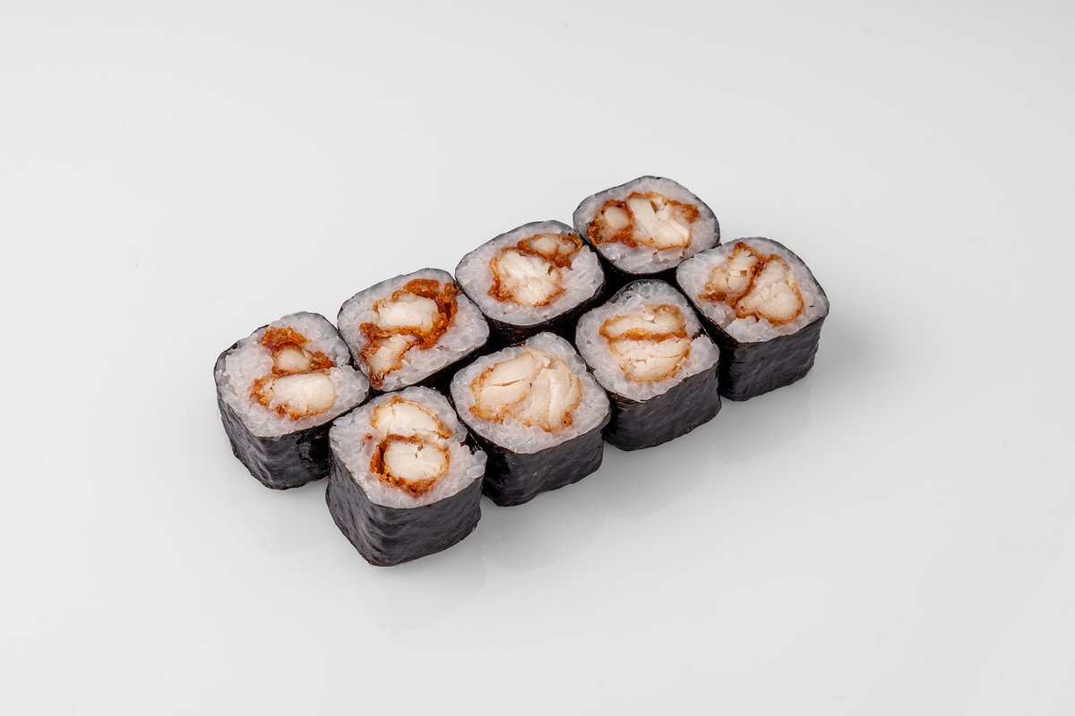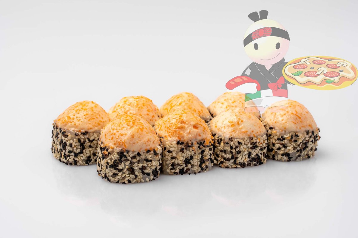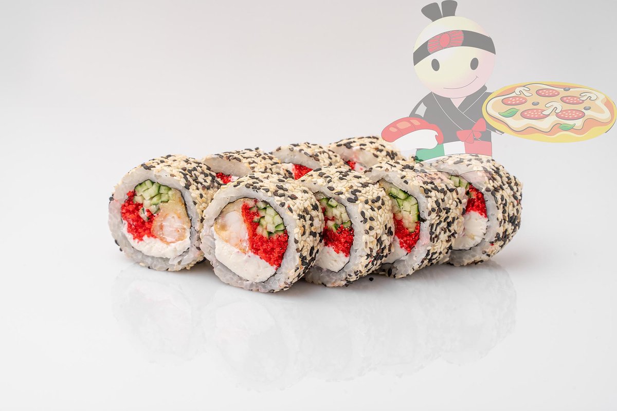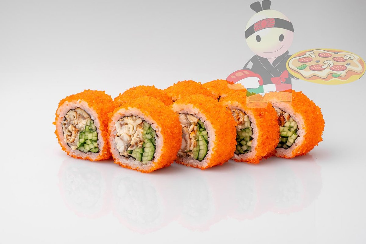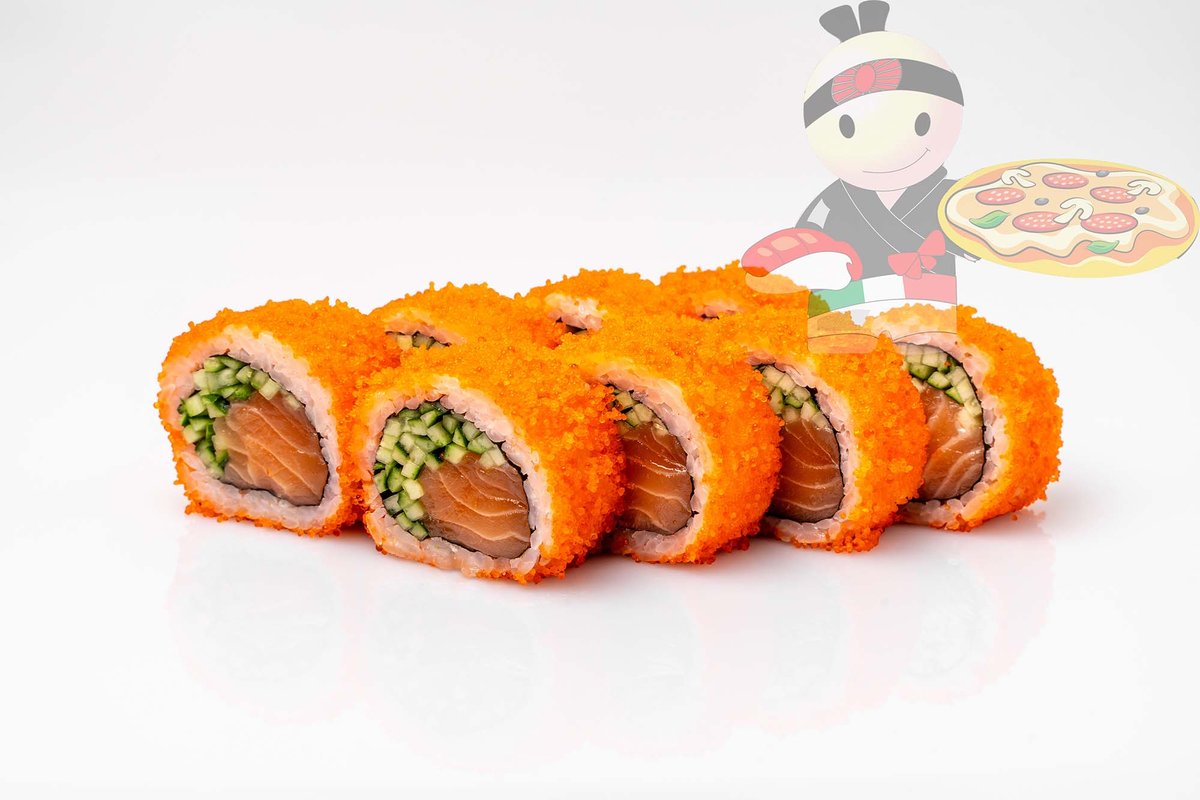 Рис, нори, креветка, лосось, огурец, сырный соус, тобико, сухари панко, кляр.