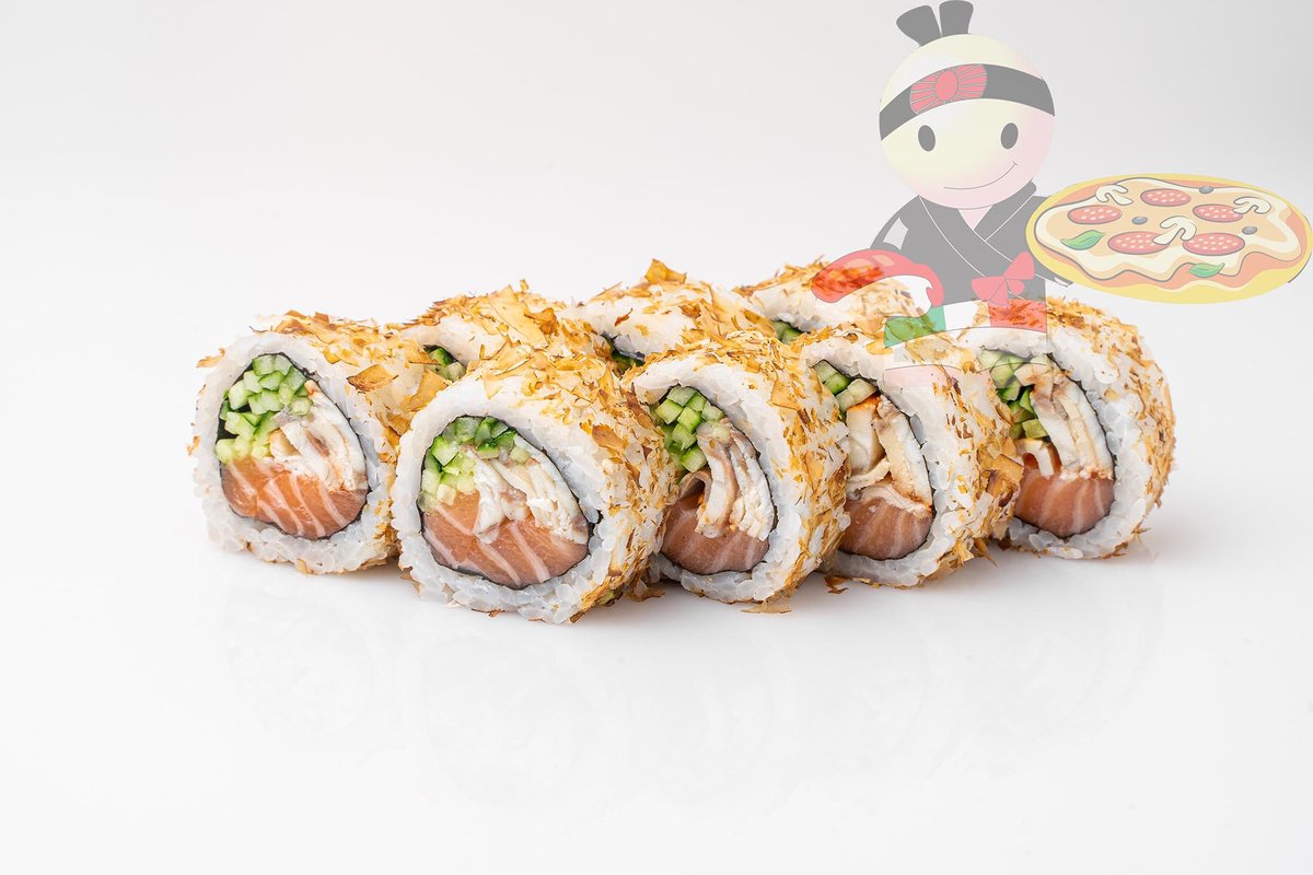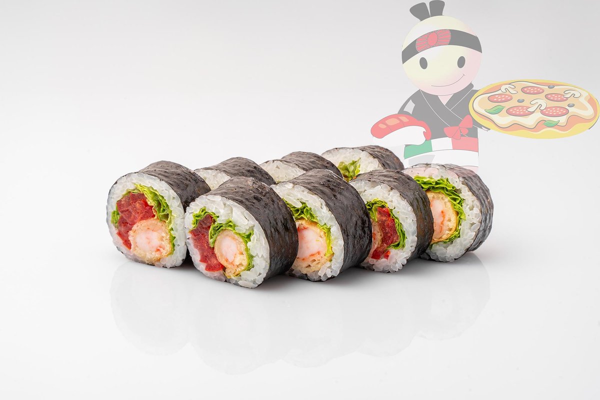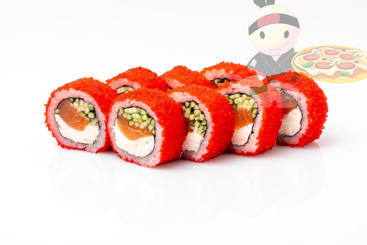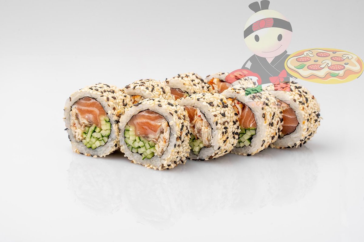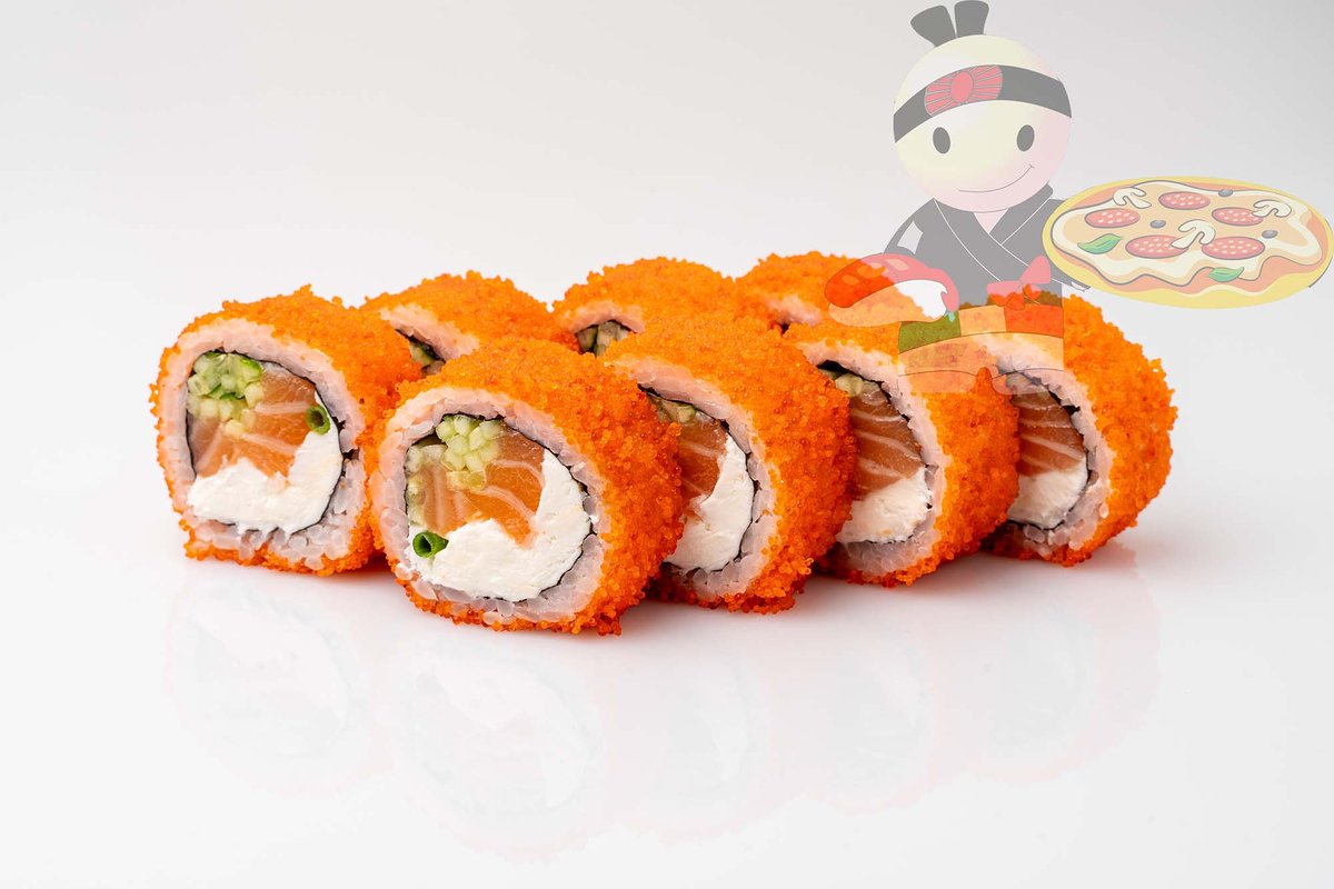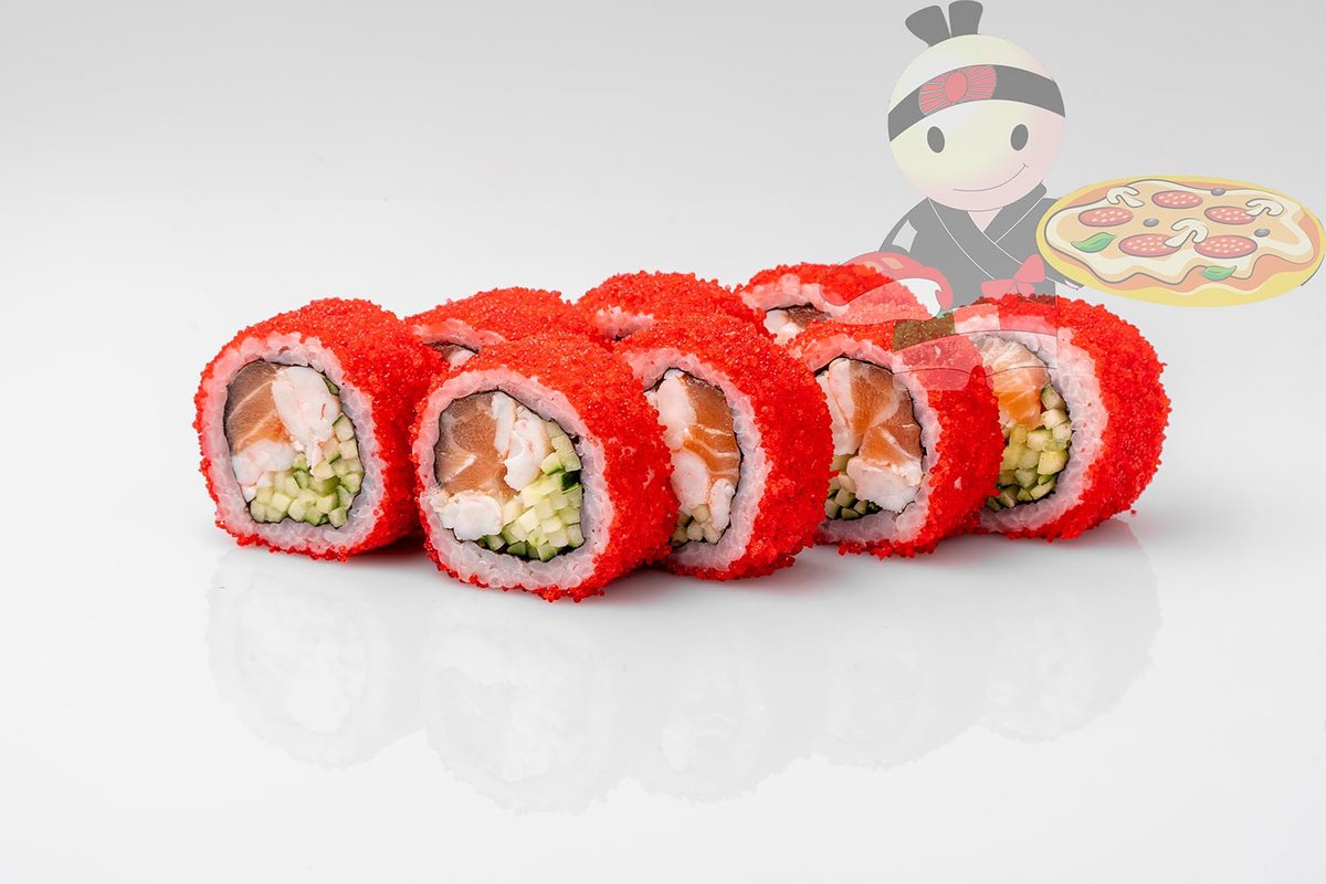 Рис, нори, креветка, лосось, огурец, сырный соус, тобико, сухари панко, кляр.