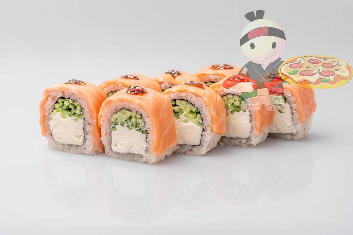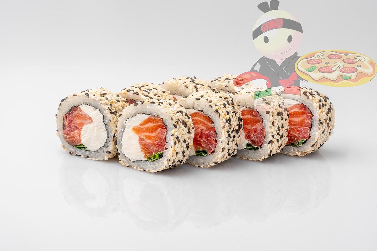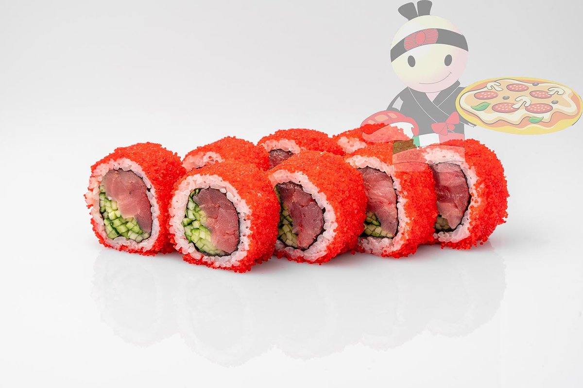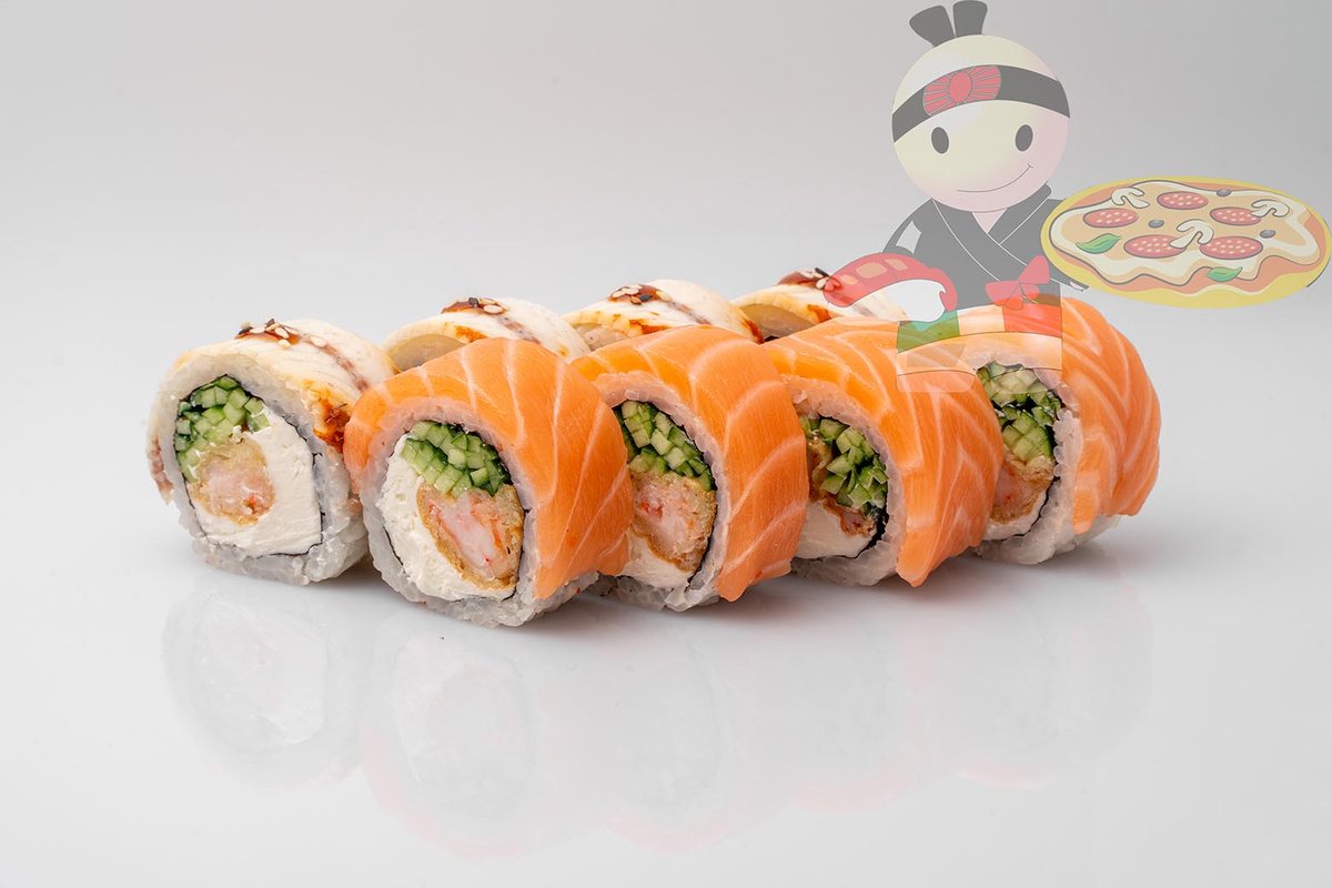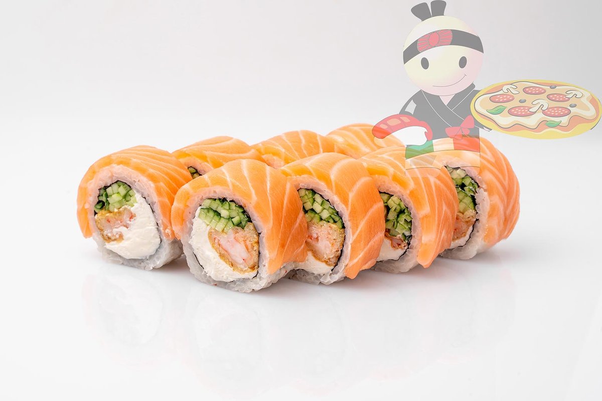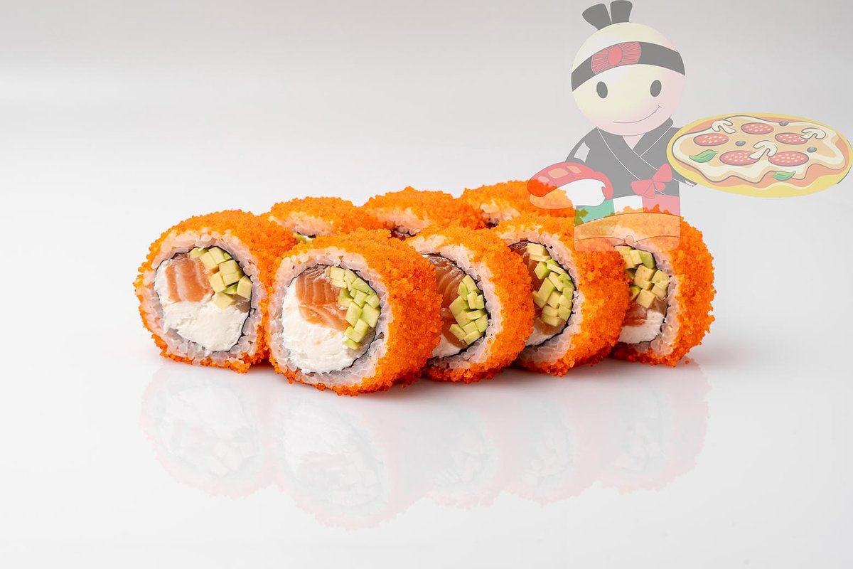 Рис, нори, креветка, лосось, огурец, сырный соус, тобико, сухари панко, кляр.