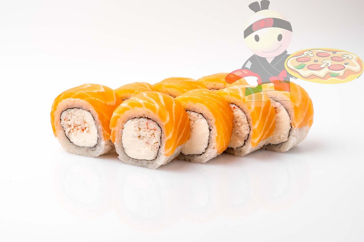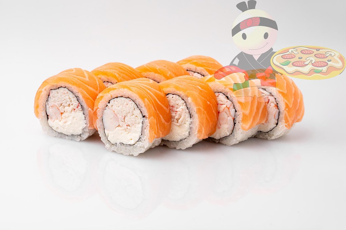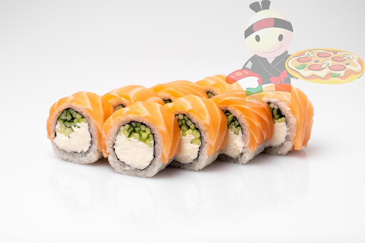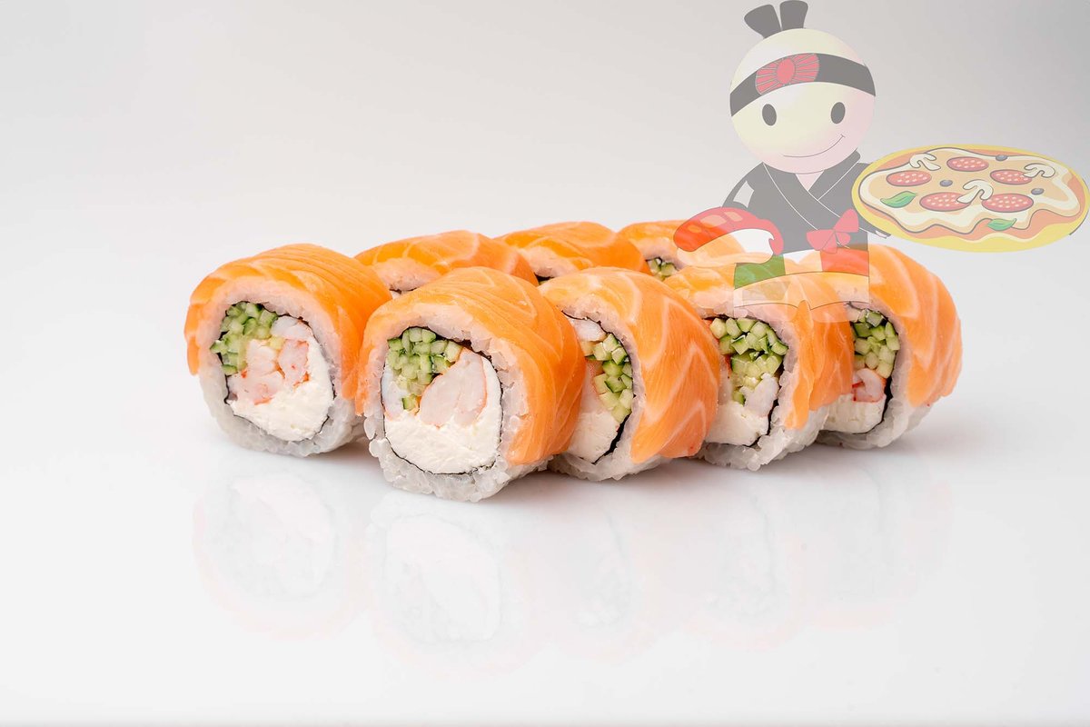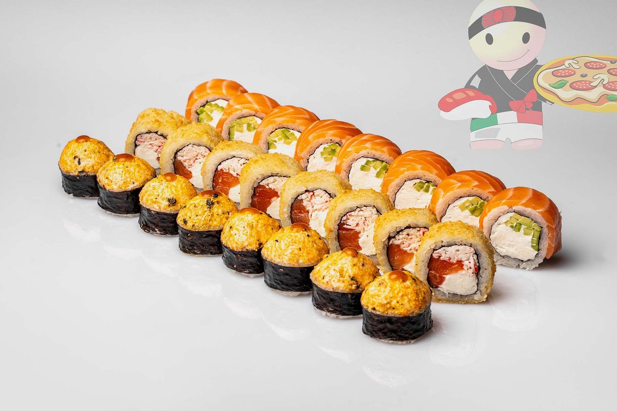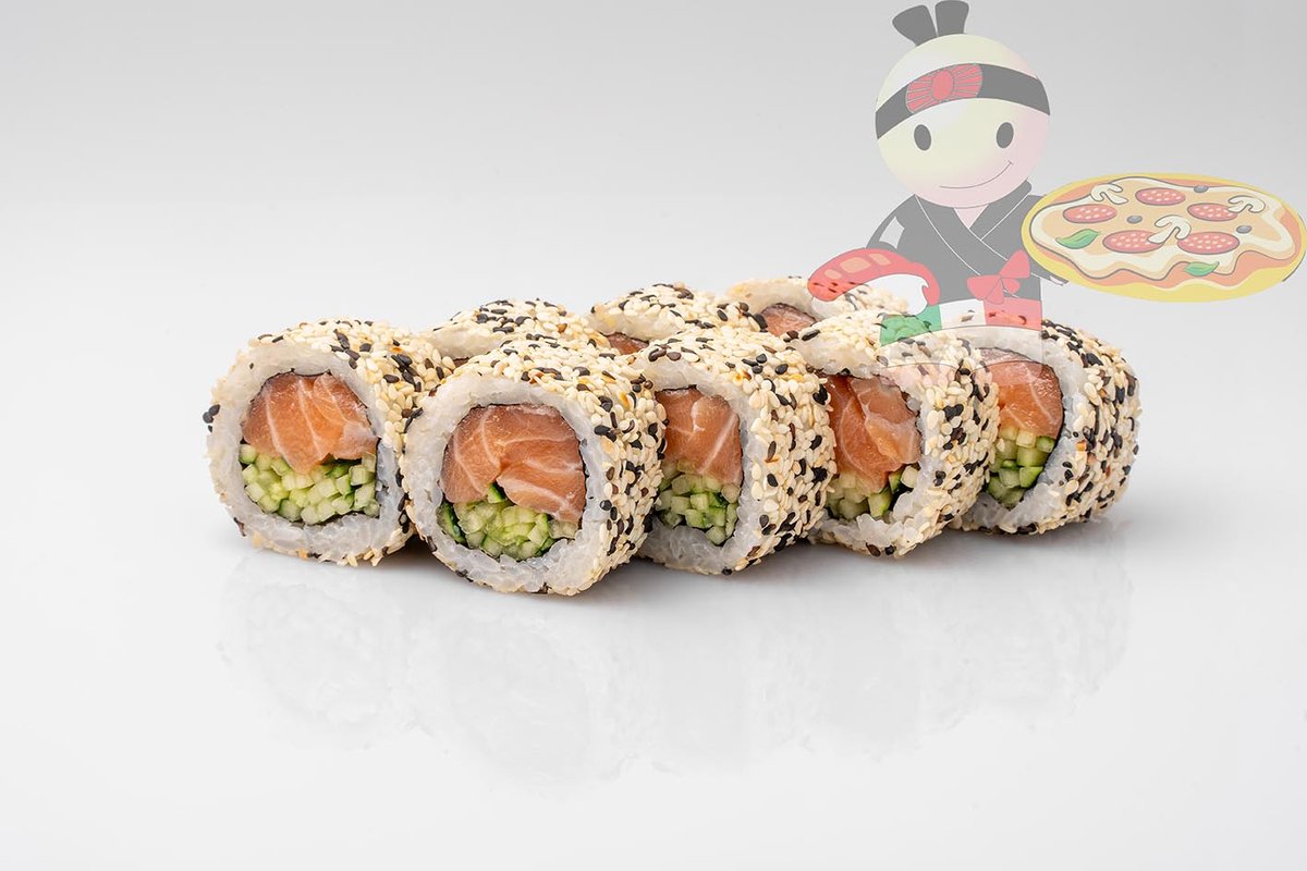 Рис, нори, креветка, лосось, огурец, сырный соус, тобико, сухари панко, кляр.