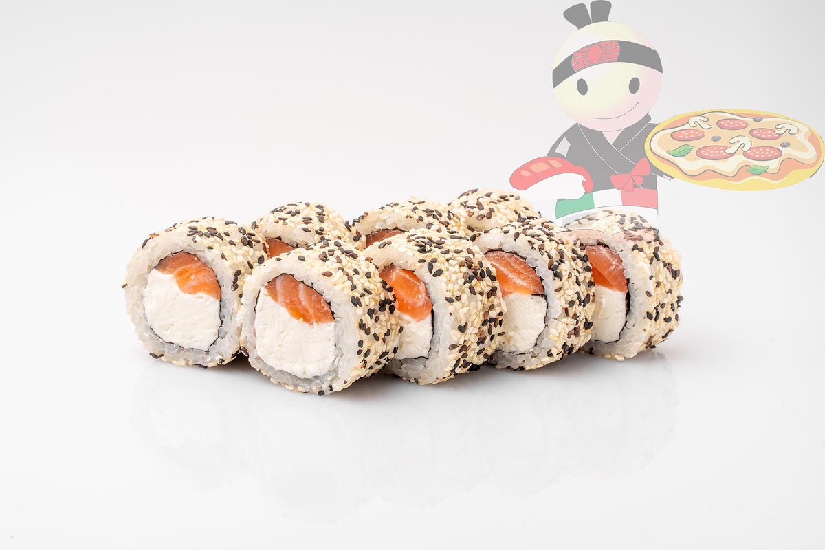Рис, нори, сливочный сыр, лосось копчный, помидор, лук зеленый, кунжут.