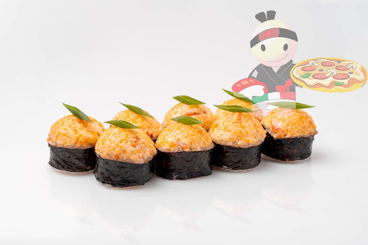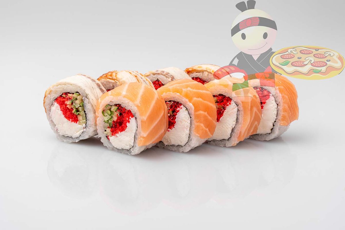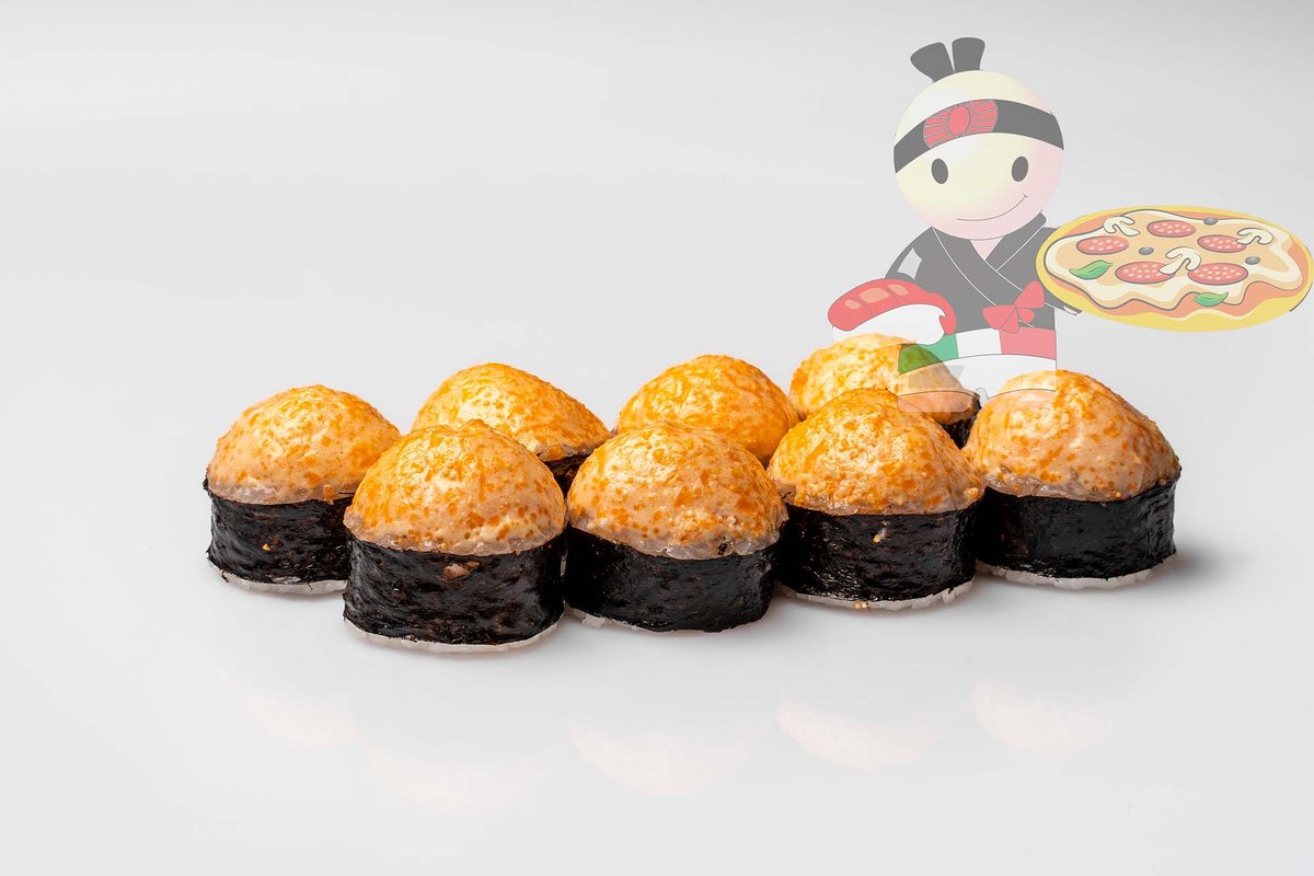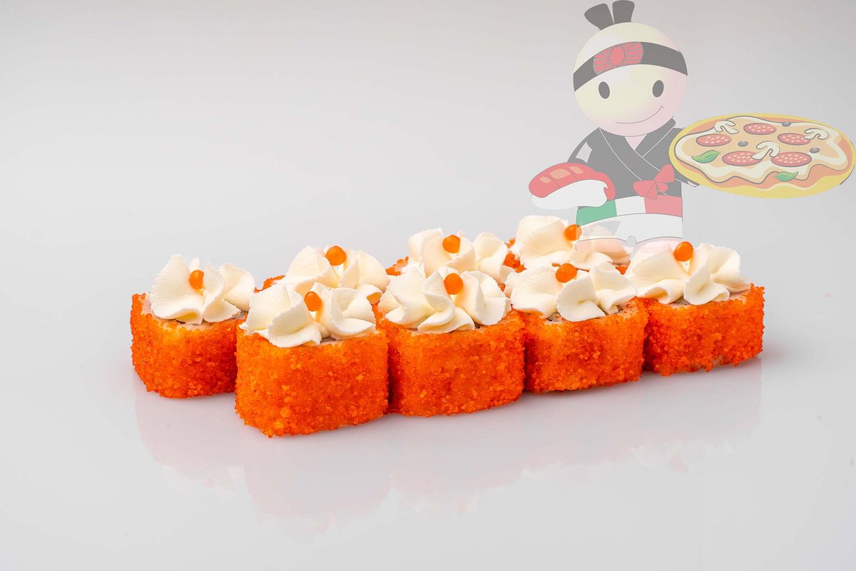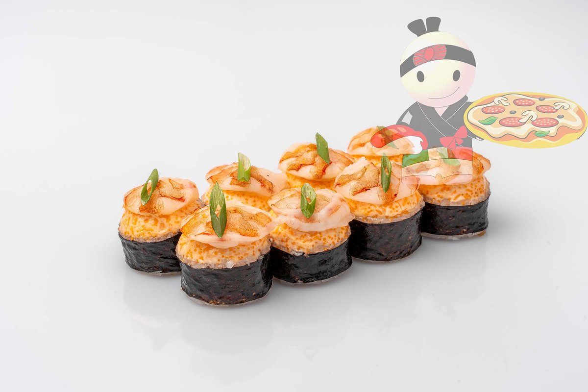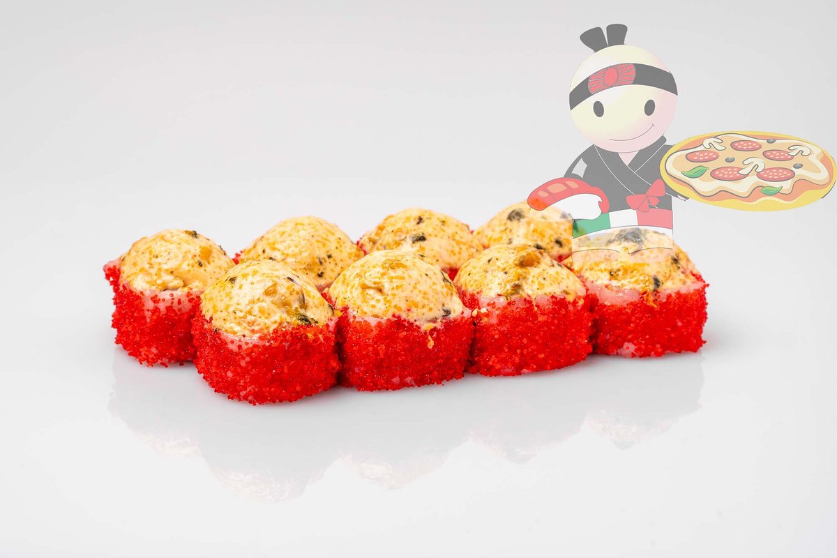 Рис, нори, спайси соус, креветка, лосось, гребешок, сырный соус, икра лососевая.