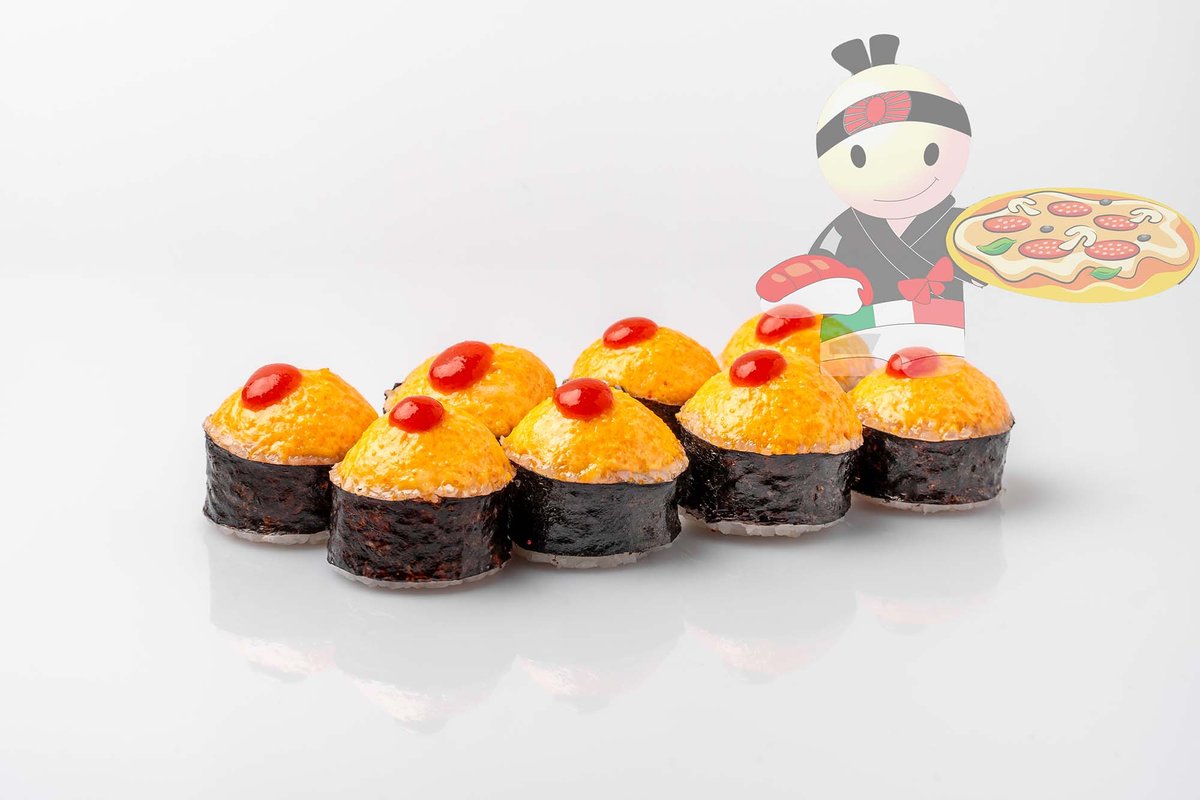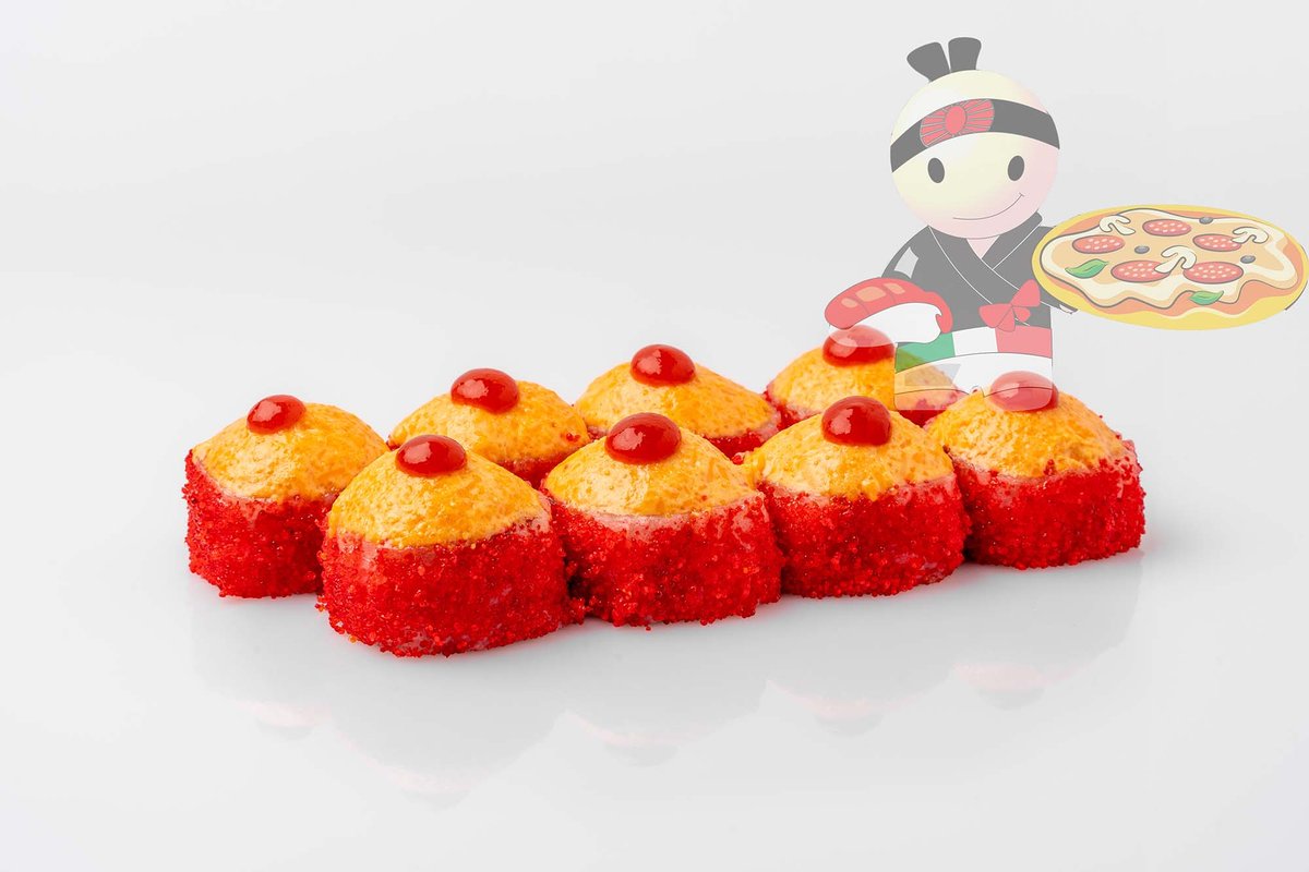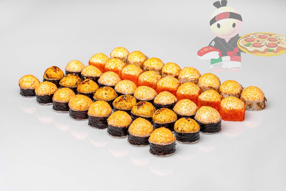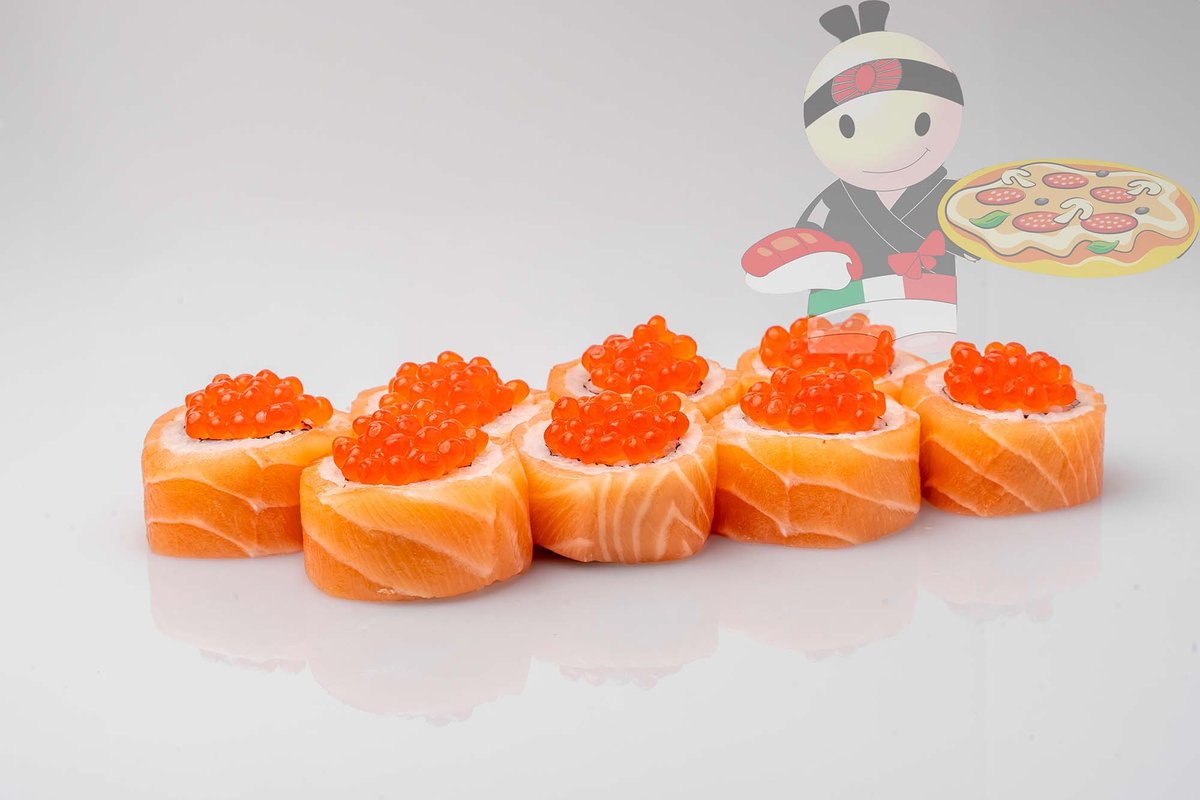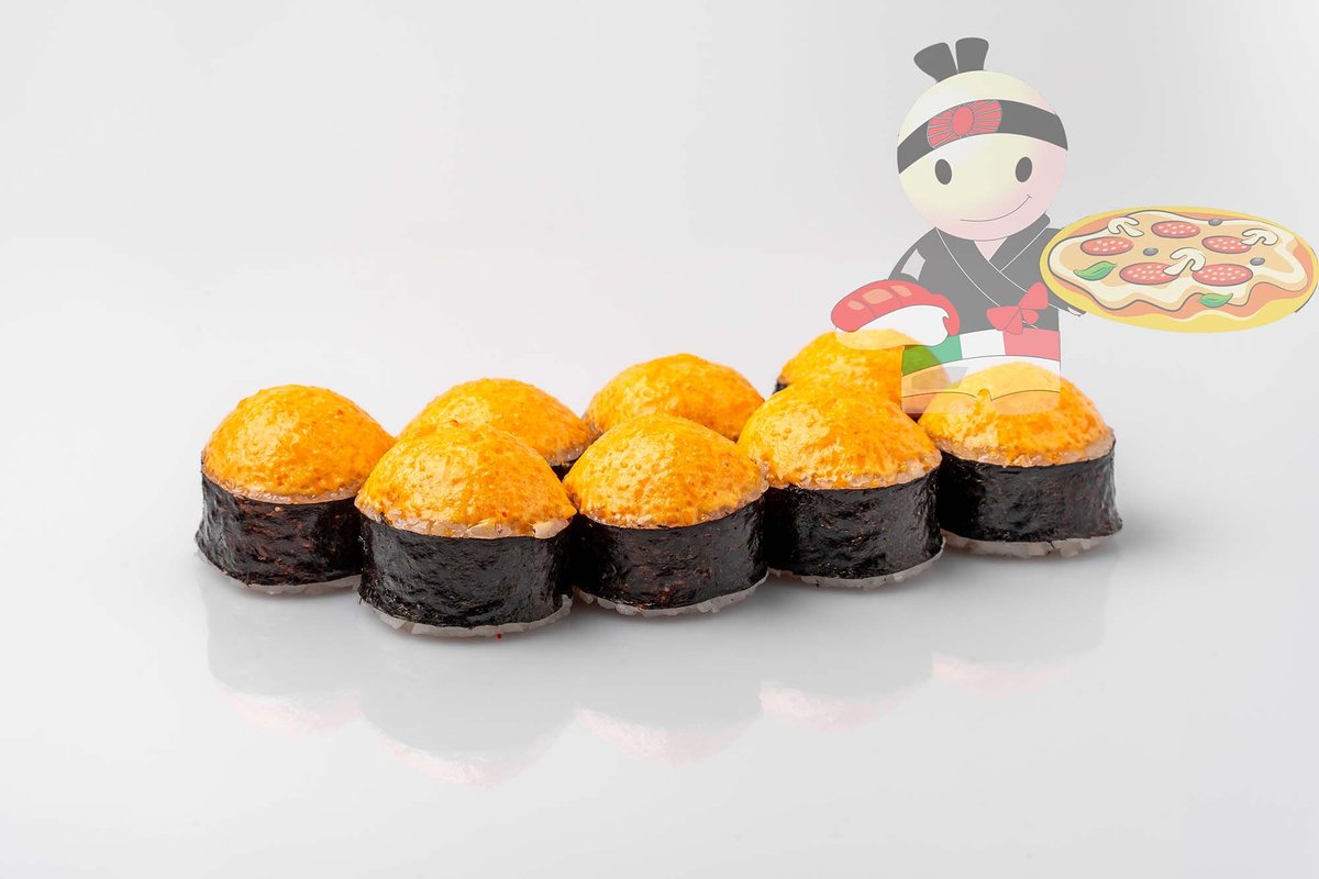 Рис, нори, спайси соус, креветка, лосось, гребешок, сырный соус, икра лососевая.