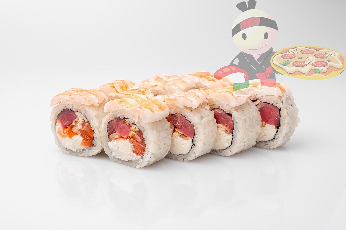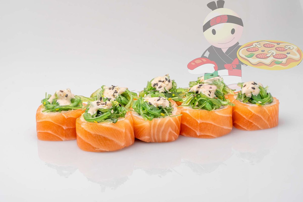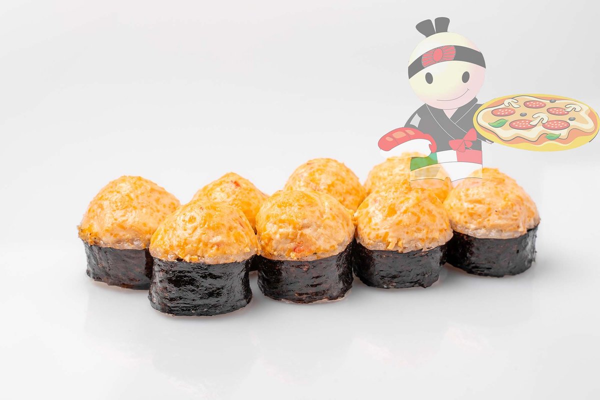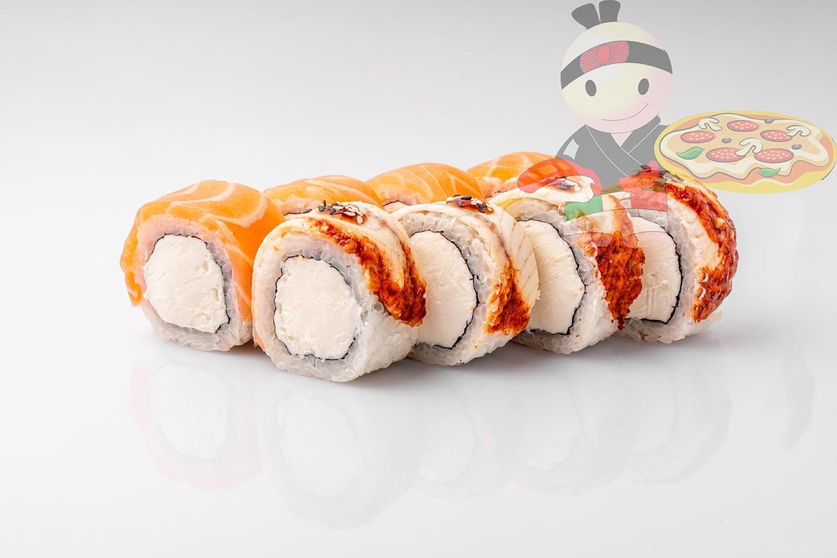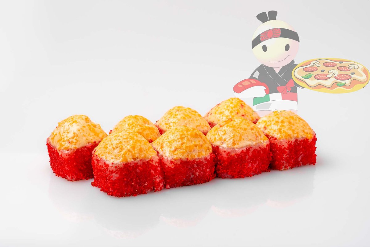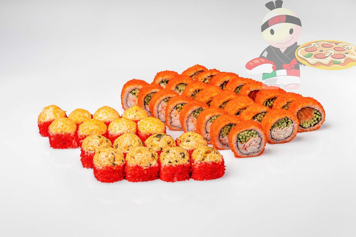 Рис, нори, спайси соус, креветка, лосось, гребешок, сырный соус, икра лососевая.
