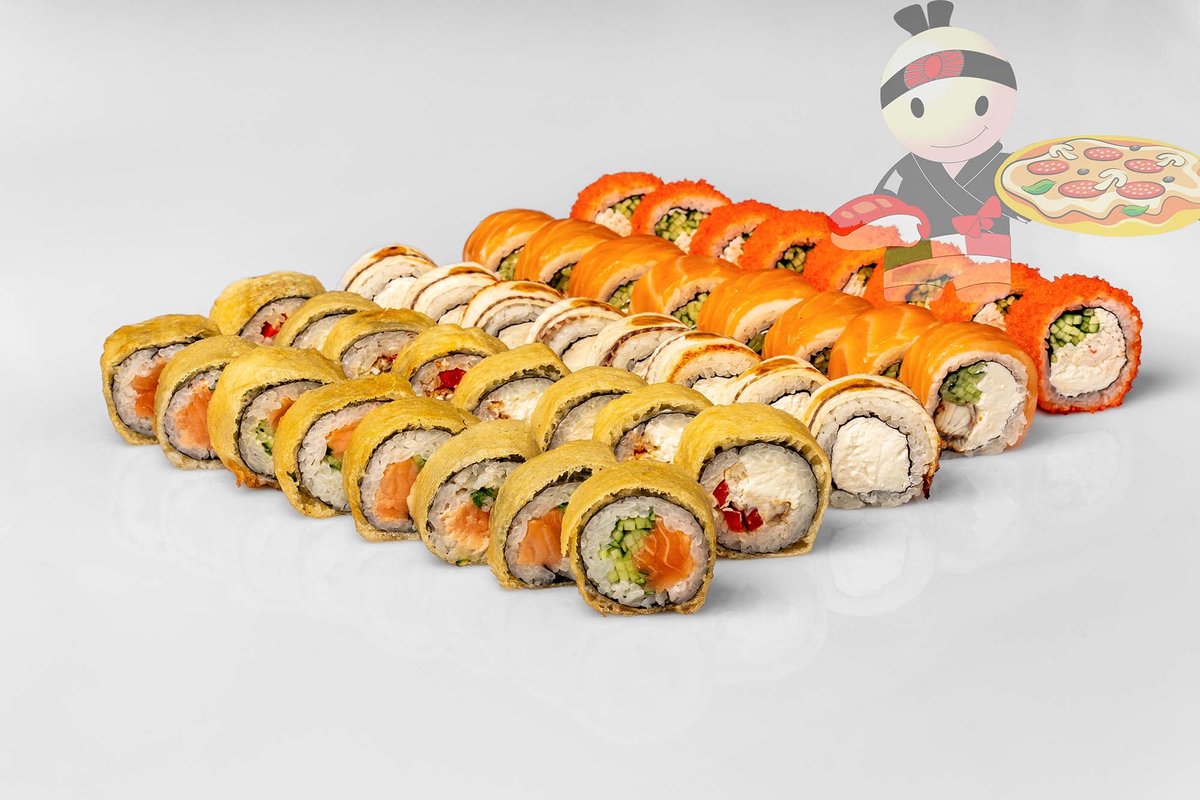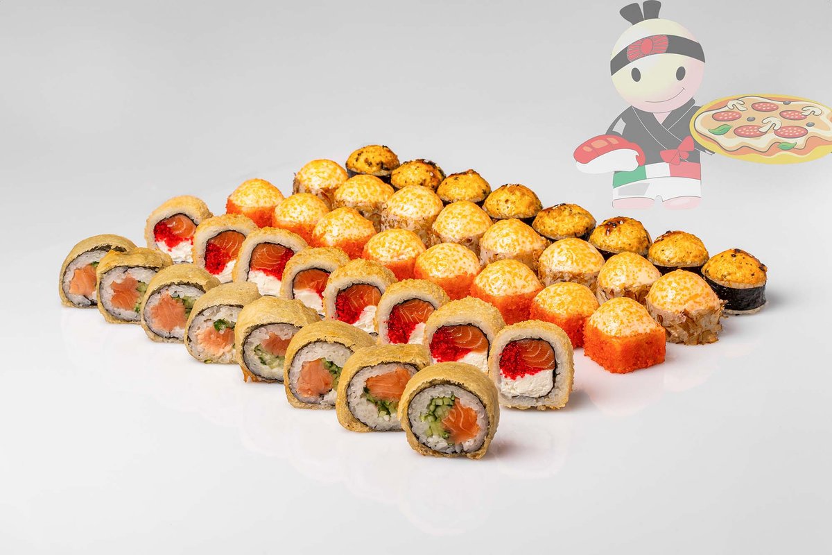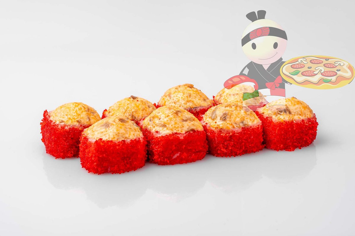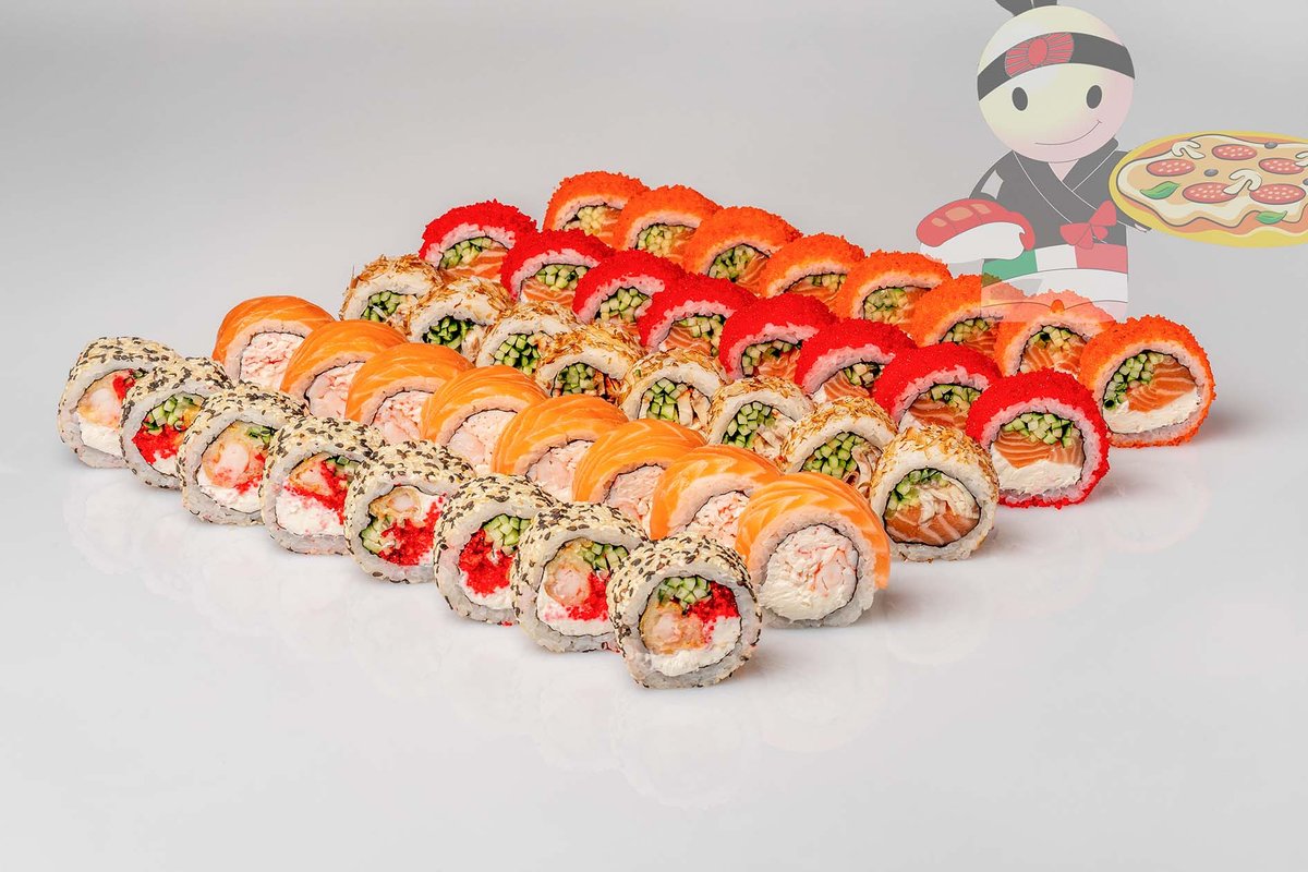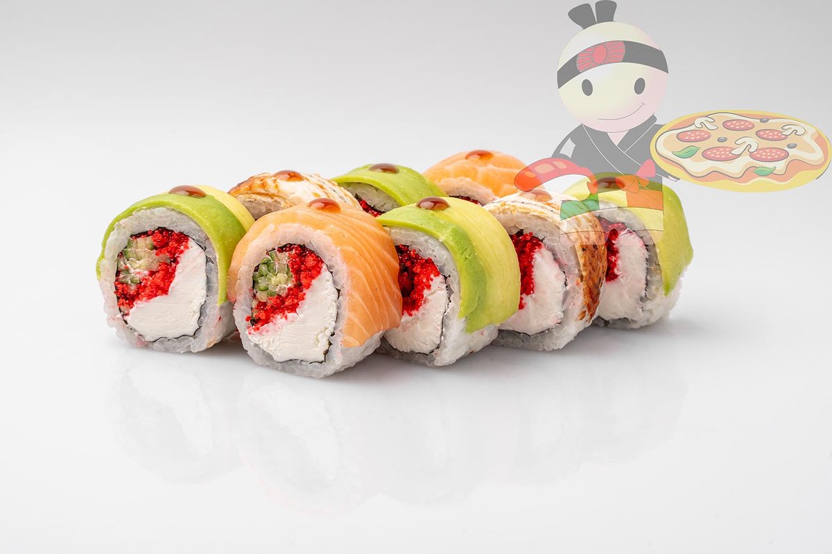 Рис, нори, спайси соус, креветка, лосось, гребешок, сырный соус, икра лососевая.