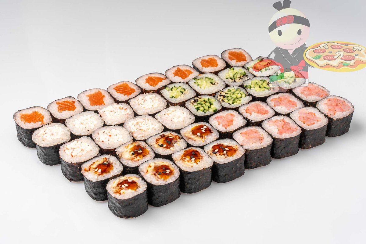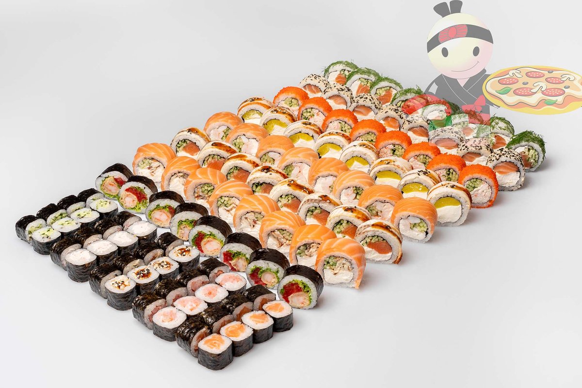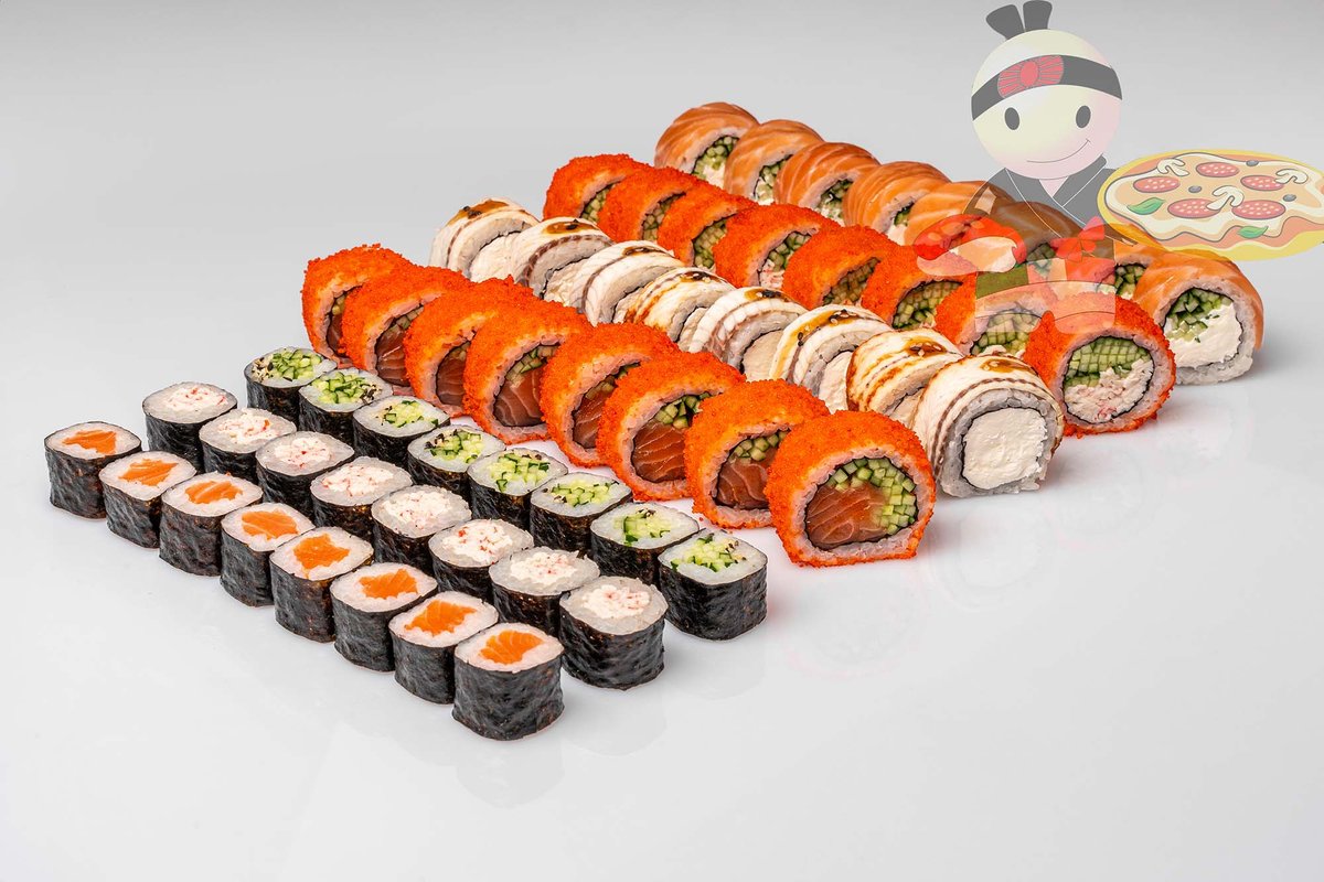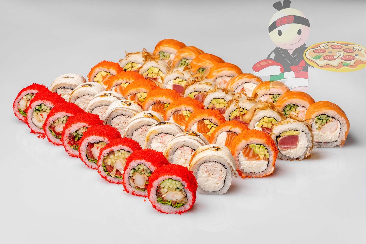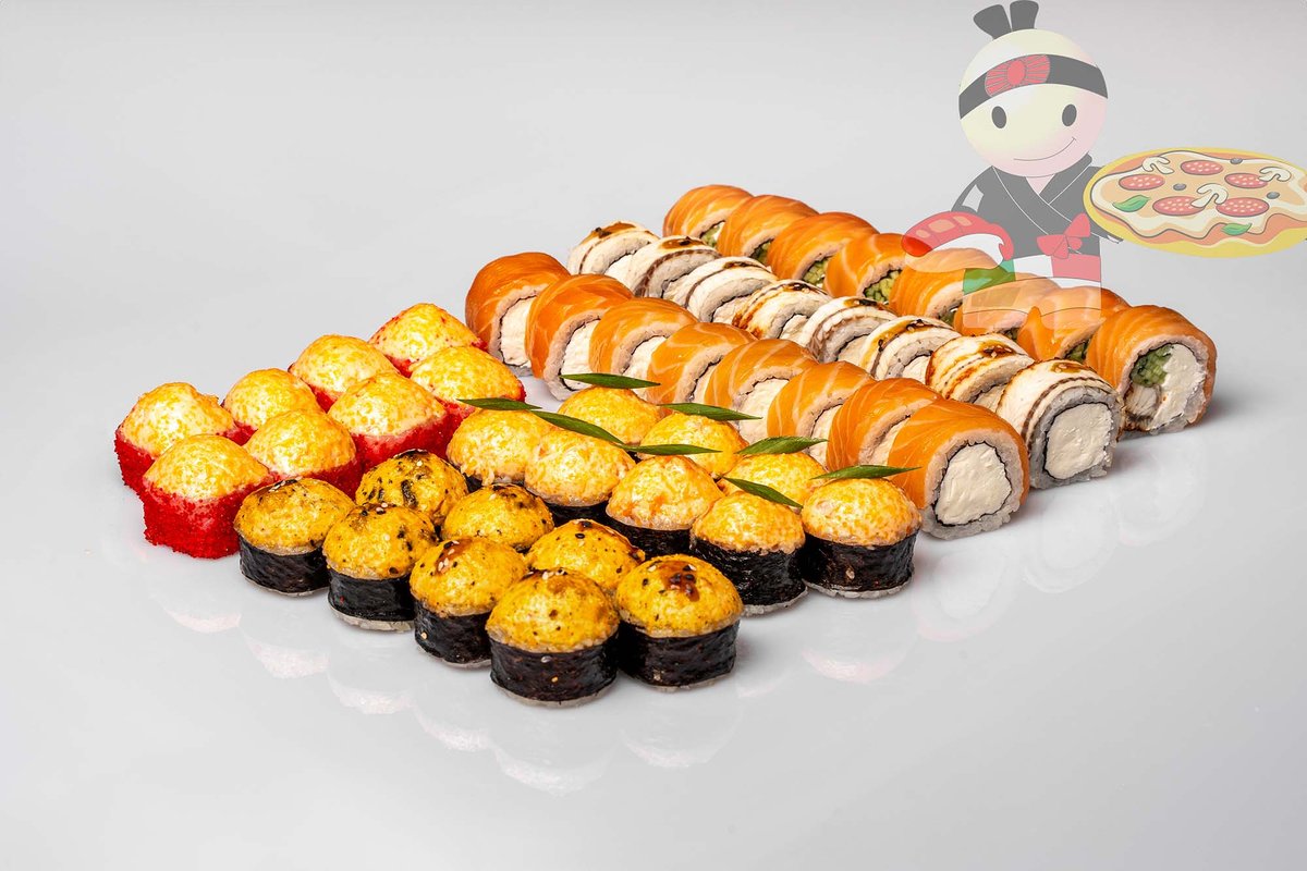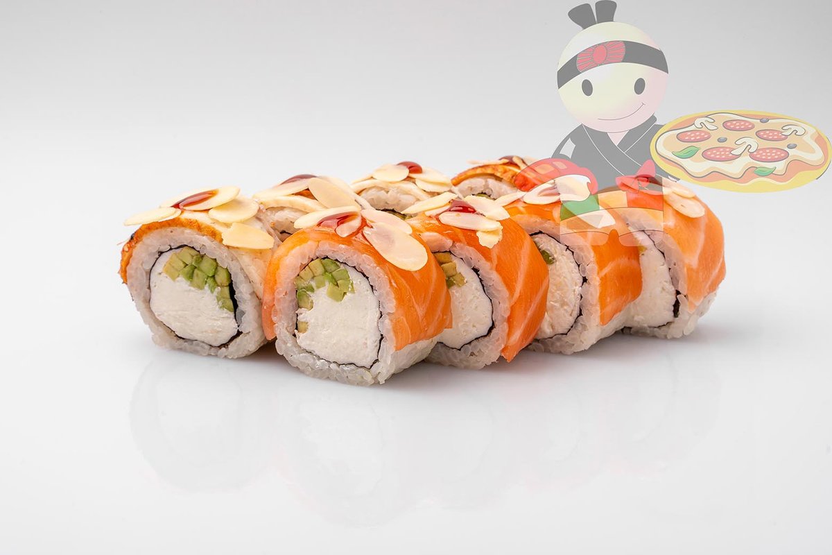 Рис, нори, спайси соус, креветка, лосось, гребешок, сырный соус, икра лососевая.