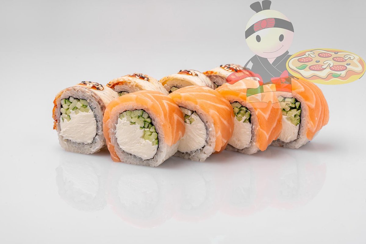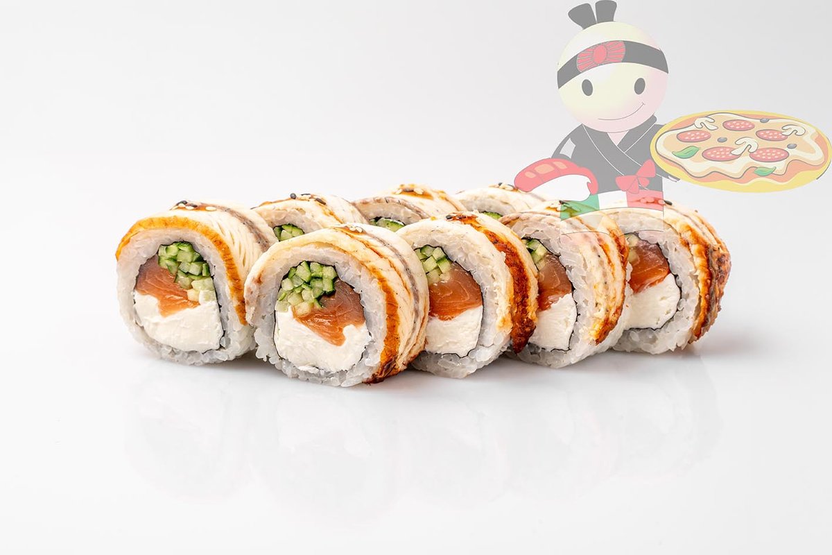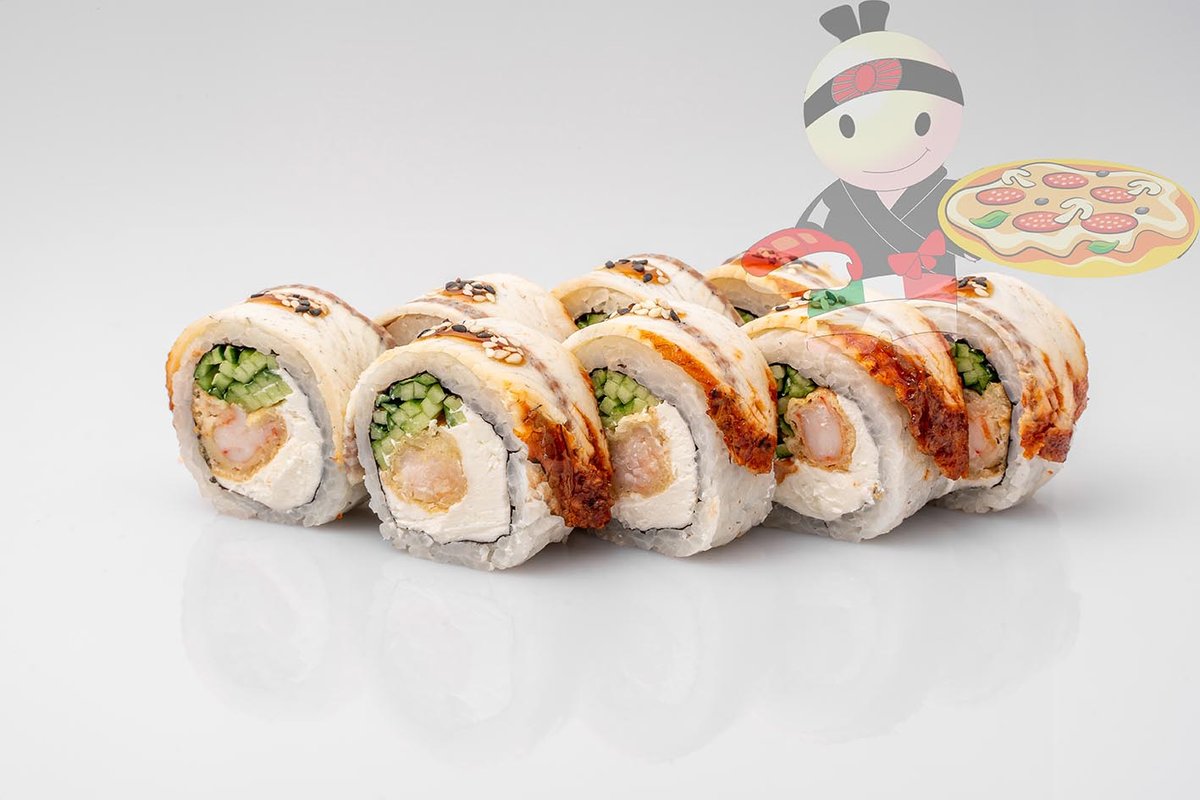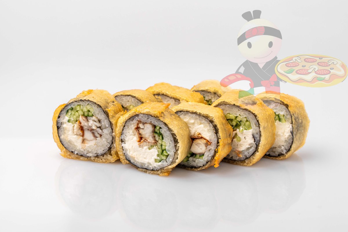Рис, нори, сливочный сыр, угорь, лосось, огурец, кляр.