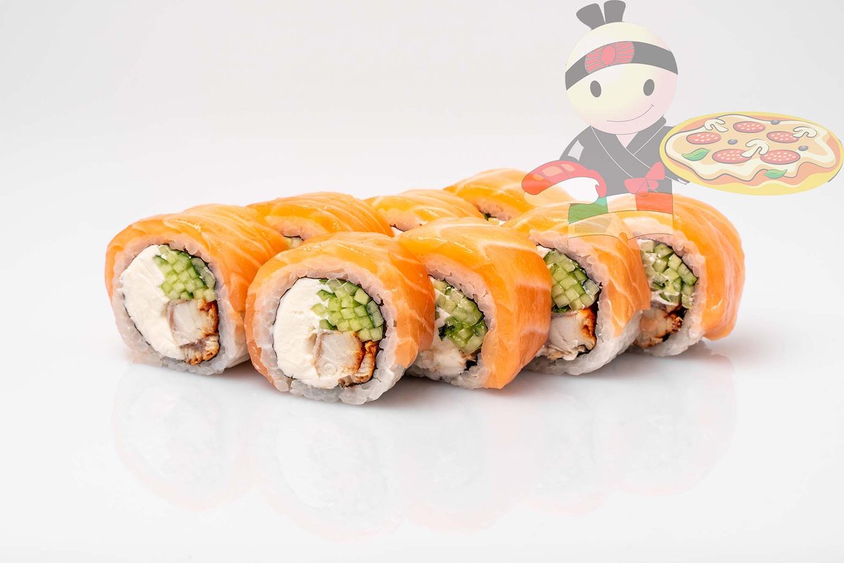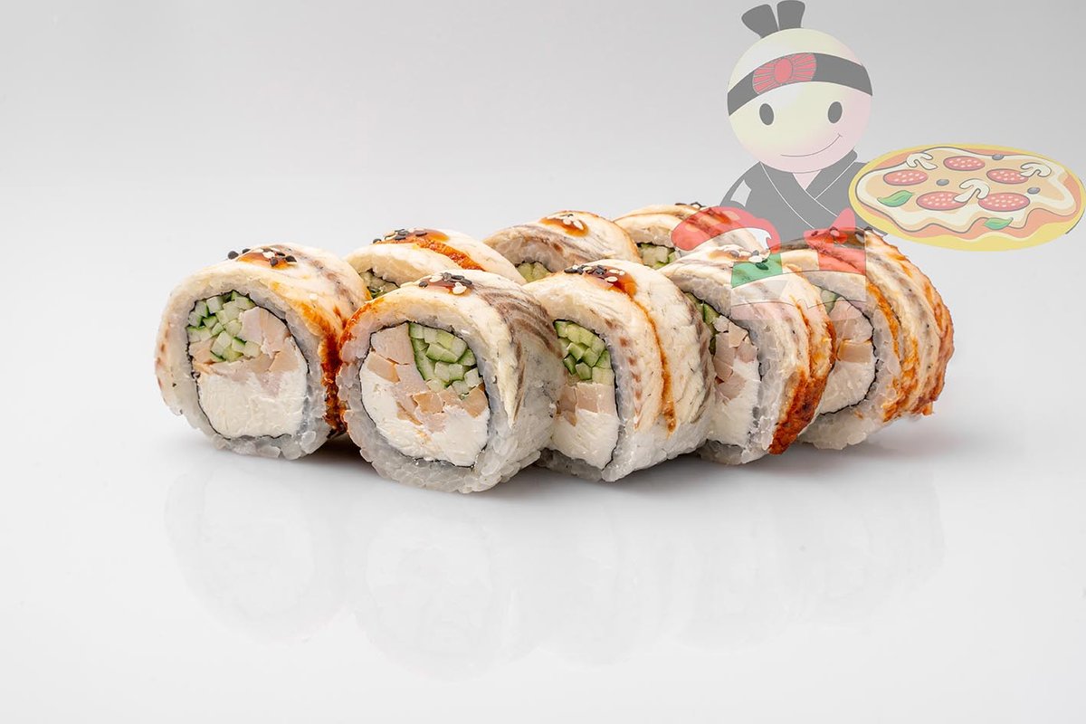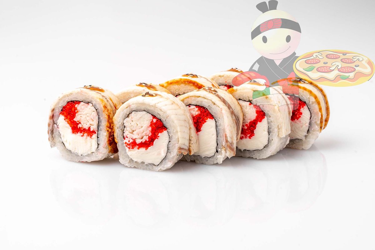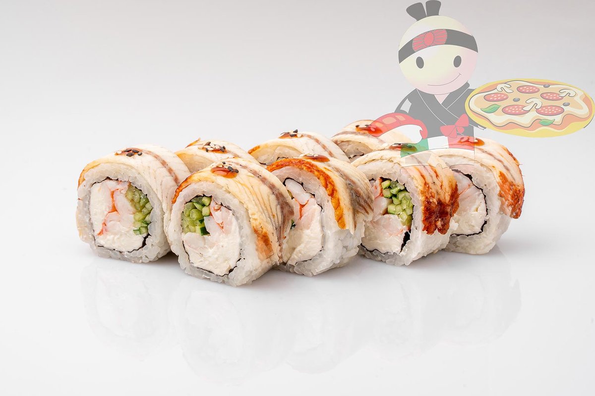 Рис, нори, сливочный сыр, угорь, лосось, огурец, кляр.
