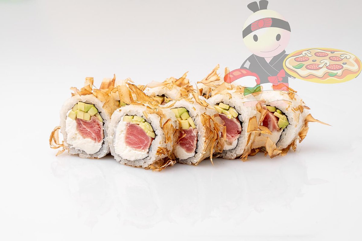 Рис, нори, сливочный сыр, обжаренный тунец, огурец, лосось.