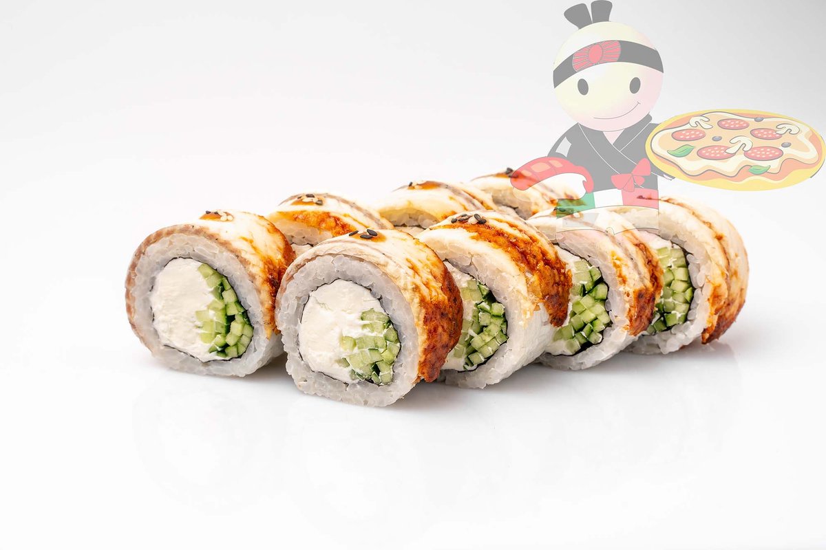 Рис, нори, сливочный сыр, угорь, огурец, кляр.