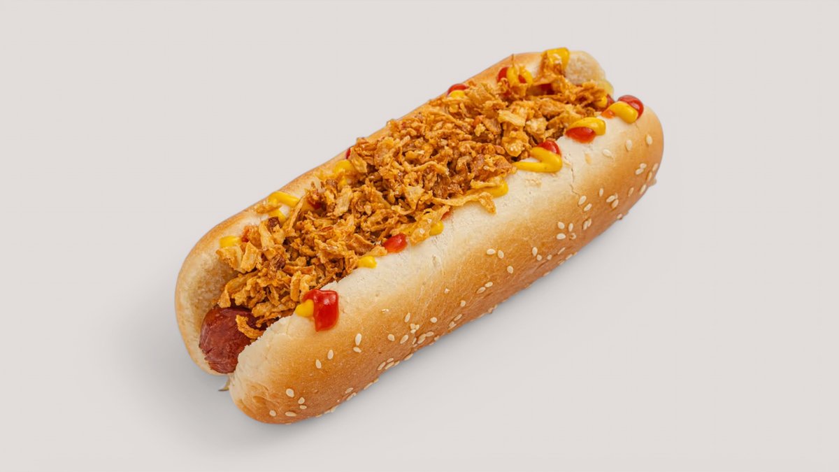 Булочка для хот дога, п/ф сосиски, кетчуп, соус горчица, майонез, лук в кляре, маринованные огурцы