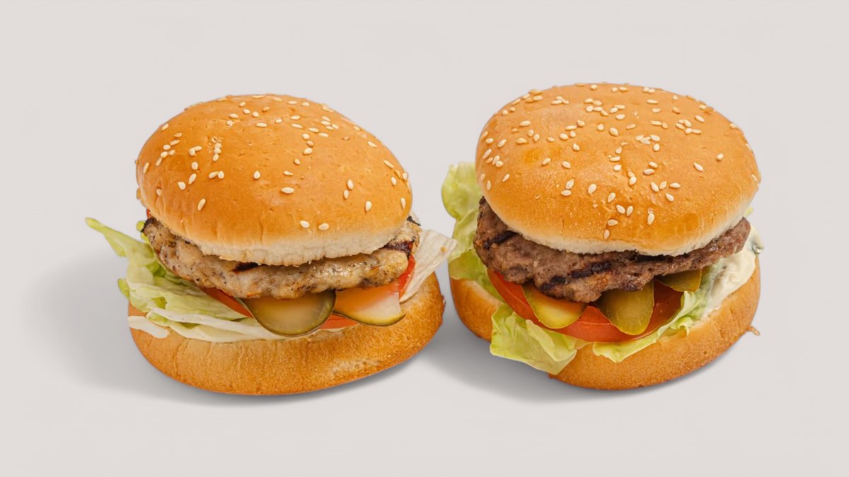 Булочки для бургера, п/ф говяжья котлета, куриная котлета, соус горчичный, лист салата, помидоры, сыр моцарелла, маринованные огурцы