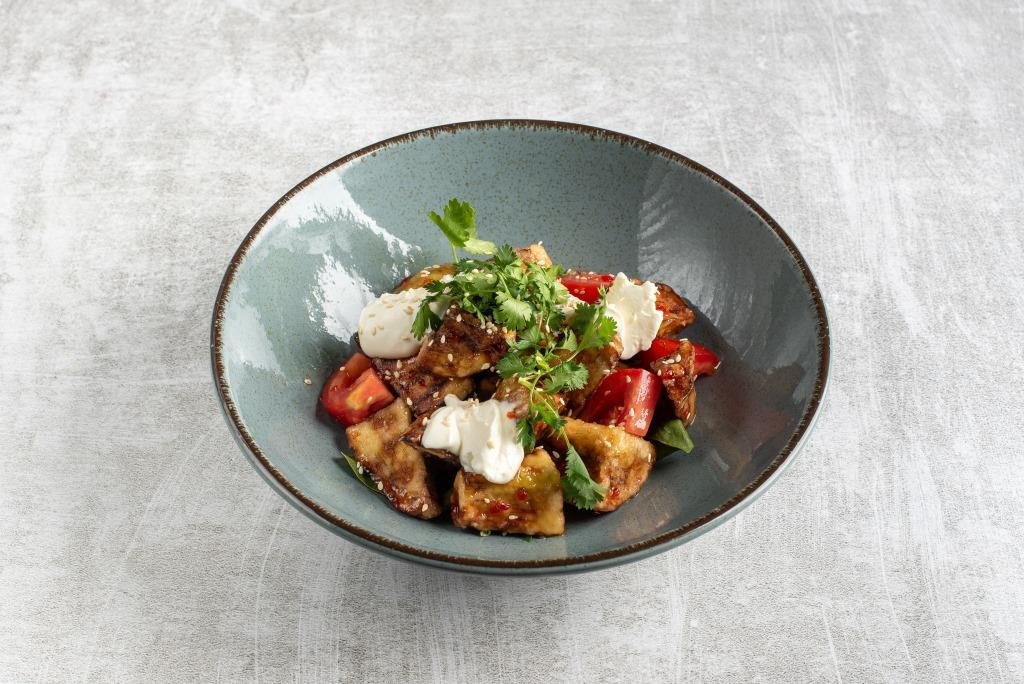 Запеченный баклажан, говяжья вырезка, помидоры конкассе, гранат, сметана, бальзамический крем, кинза, соус песто, гречневые чипсы