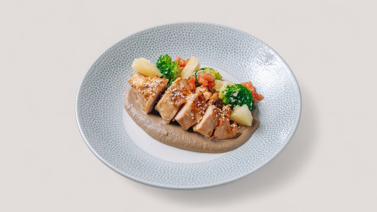 Нежная куриная грудка с бархатистым пюре из грибов, подается с брокколи, ананасом и томатами