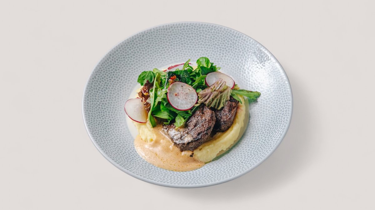 Телячьи щеки су-вид, картофельное пюре, соус демиглас, обжареный шпинат, зеленый лук