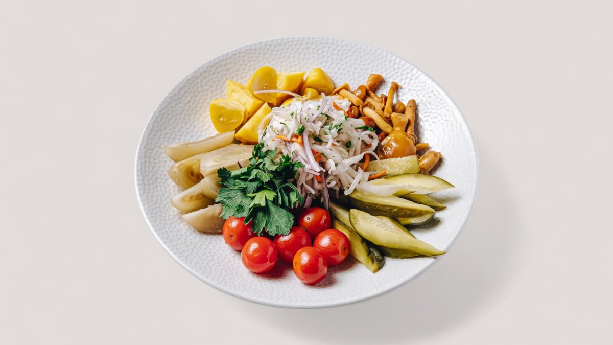 Ассорти из патиссонов, черри, баклажанов, опят и малосольных огурцов