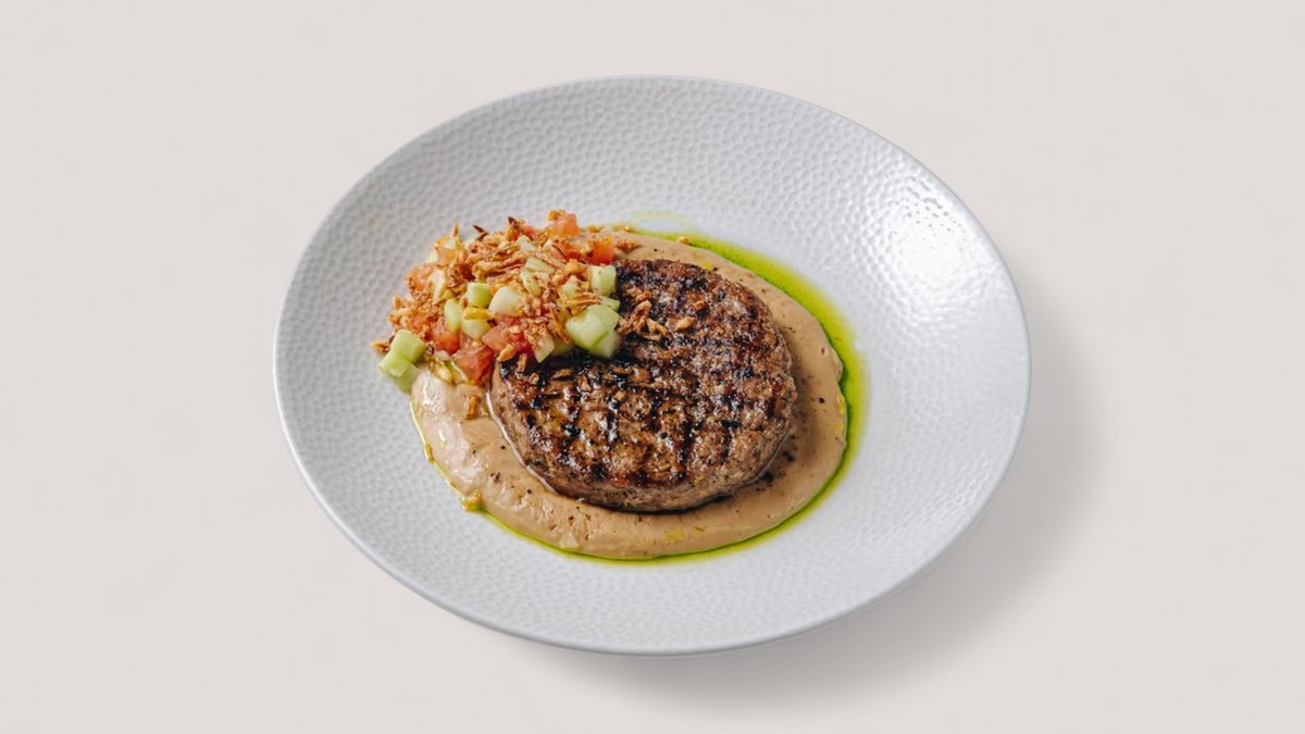 Нежный бифштекс с пюре из жаренного картофеля, свежими огурцами и помидорами
