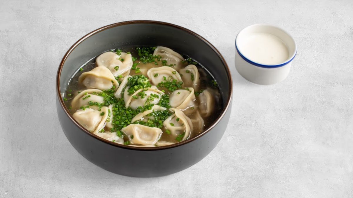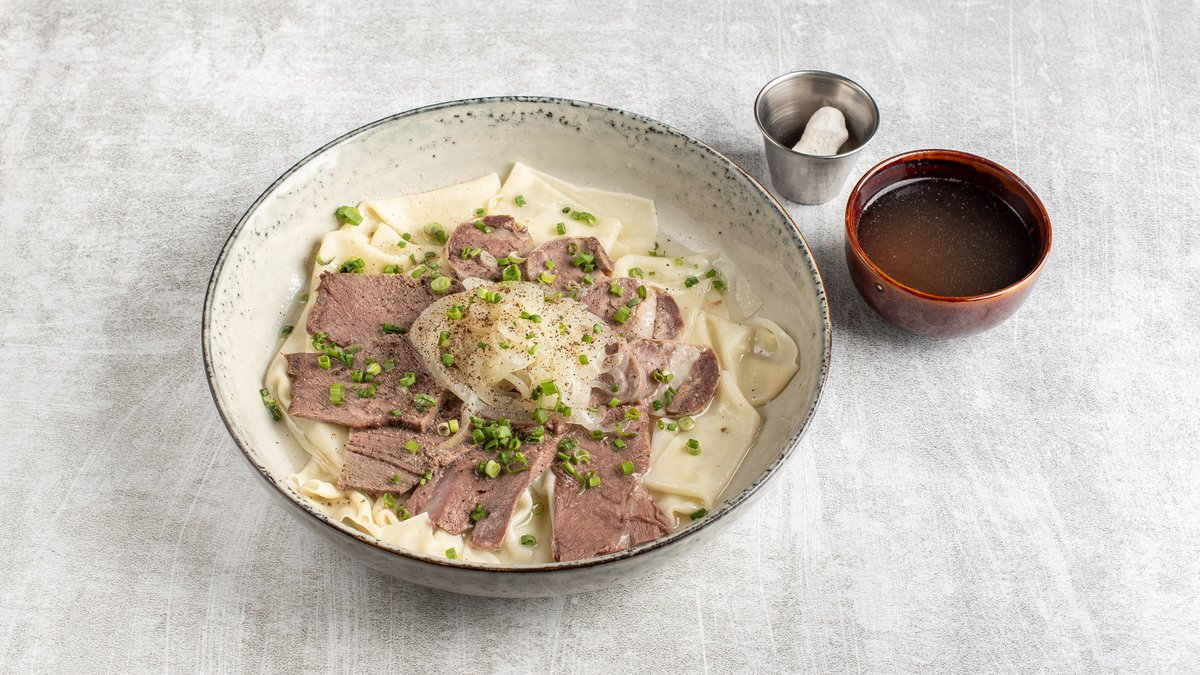 Тонкое тесто сваренное в ароматном бульоне, подается с казы, жая, нежной бараниной и отварным говяжьим языком. Подаем с бульоном и куртом