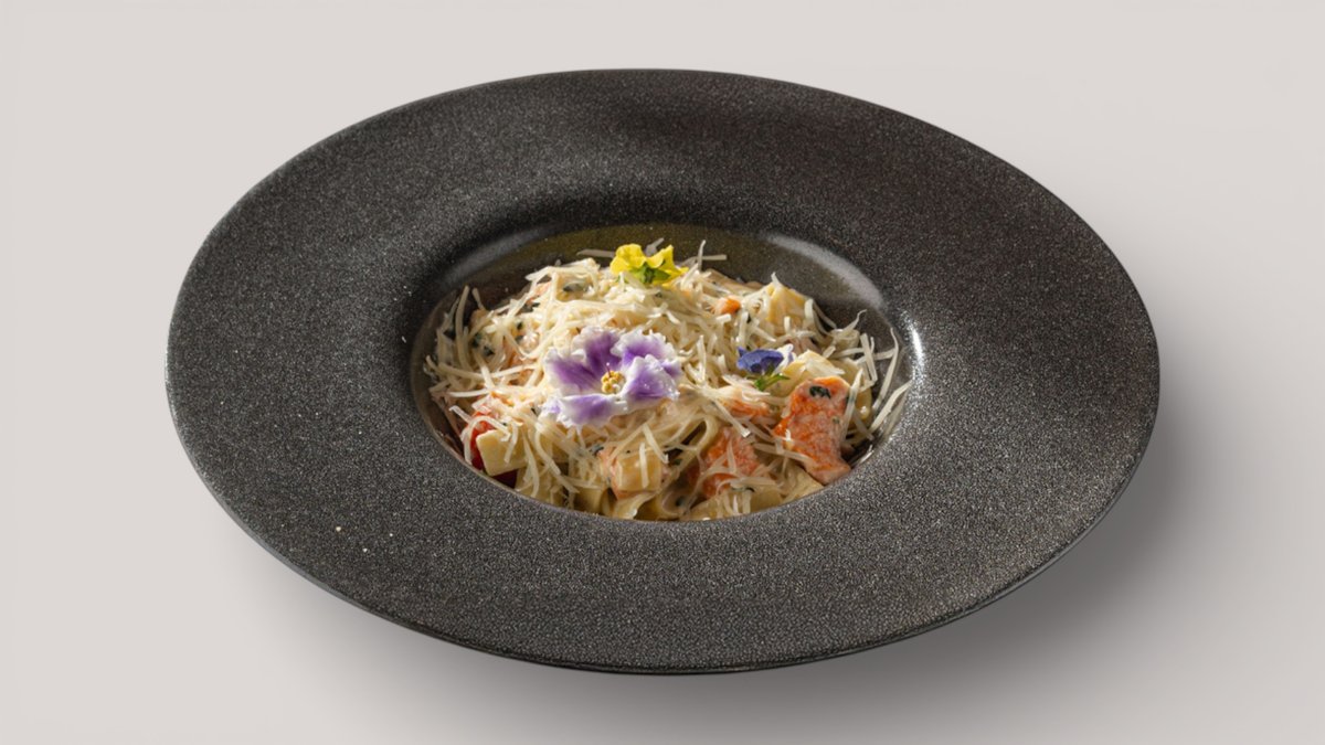 Паста со сливочным соусом, томатами черри, шпинатом и нежным лососем