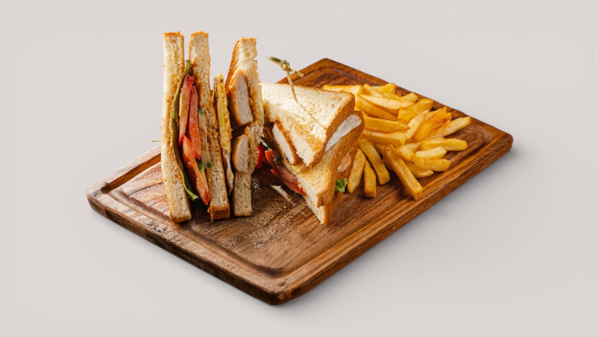 Многослойный сэндвич на тостерном хлебе с куриным шницелем, яйцом, свежими томатами, огурцами и салатом. Подается с картофелем фри