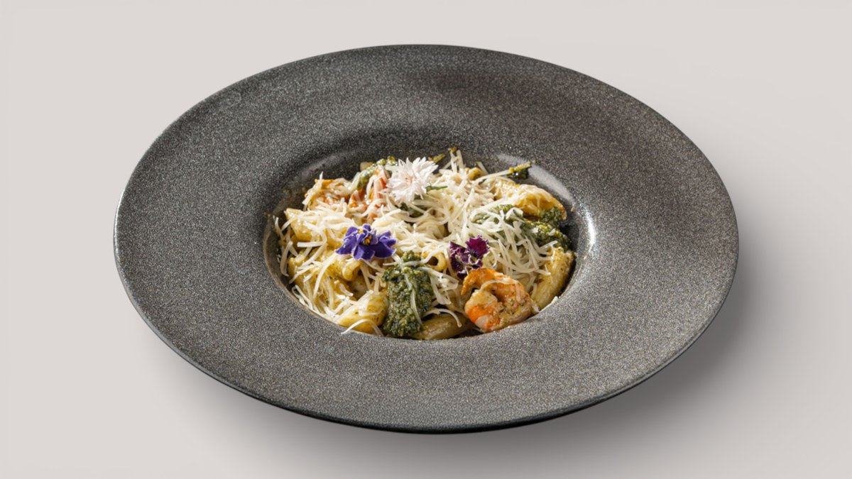 Паста с креветками, ароматным соусом Песто, томатами черри и чесноком