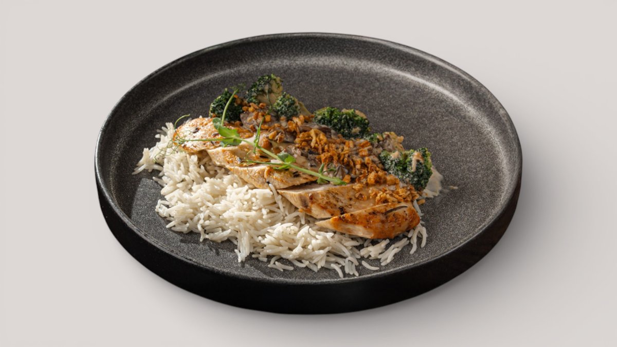 Нежная куриная грудка обжаренная на гриле, подается с шампиньонами, брокколи в сливочном соусе и рисом