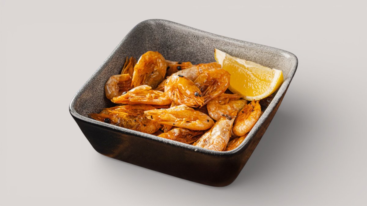 Обжаренные креветки со специями и чесноком, с долькой лимона