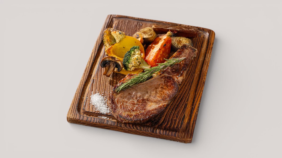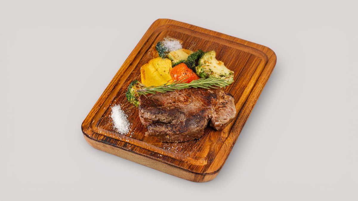 Стейк, обжаренный на ароматном масле с розмарином, подается с нежным перечным соусом и овощами гриль