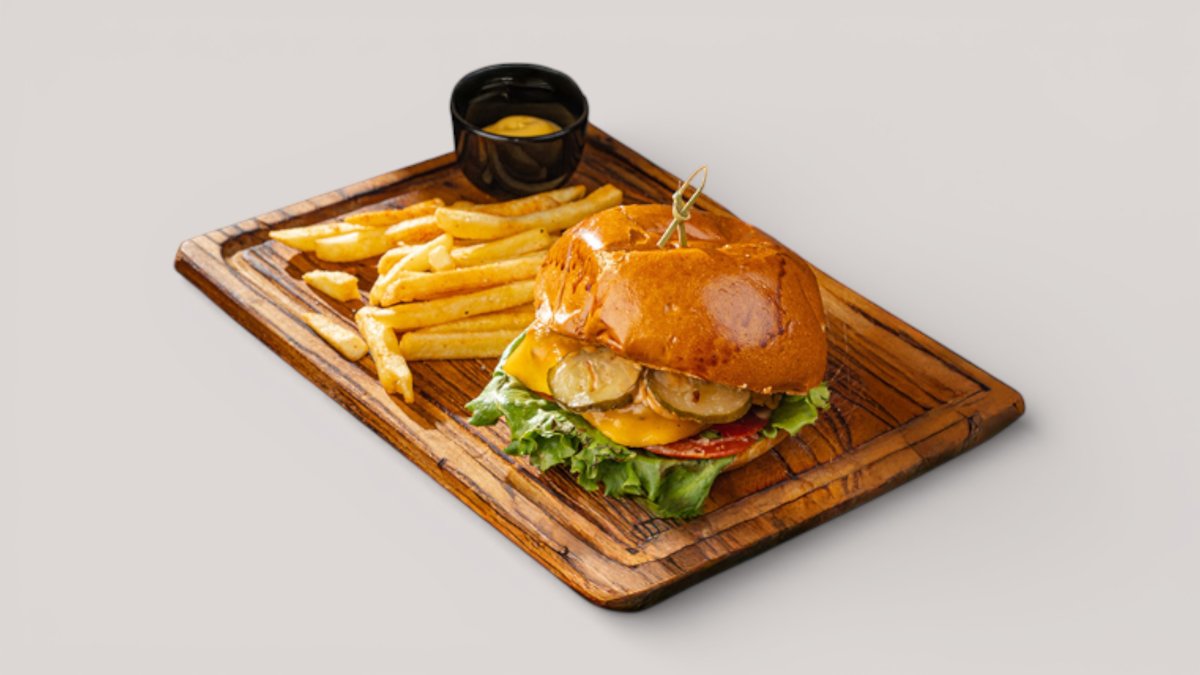 Пышная булочка бриошь с сочной котлетой, свежими овощами, сыром чеддер и фирменным соусом. Подается с картофелем фри