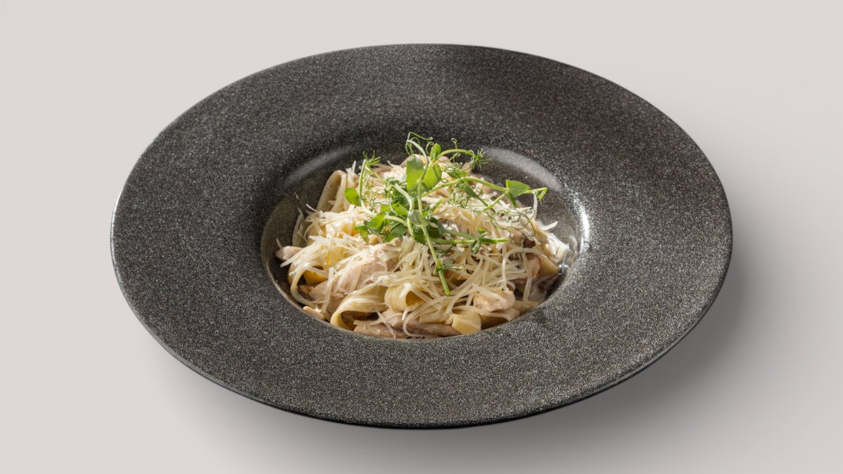 Паста в насыщенном сливочно-сырном соусе, курицей и грибами