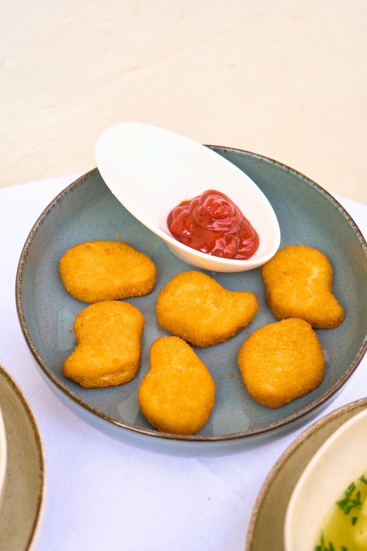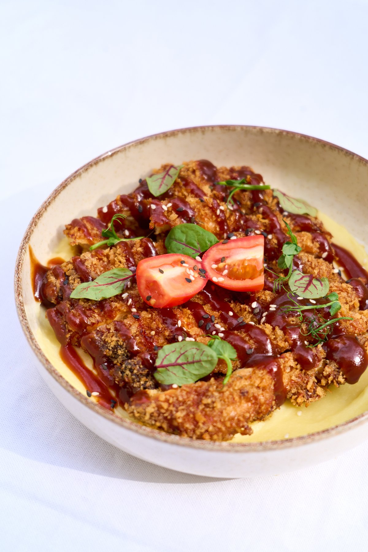 (куриное филе, панировочные сухари, пюре картофельное, соус барбекю)