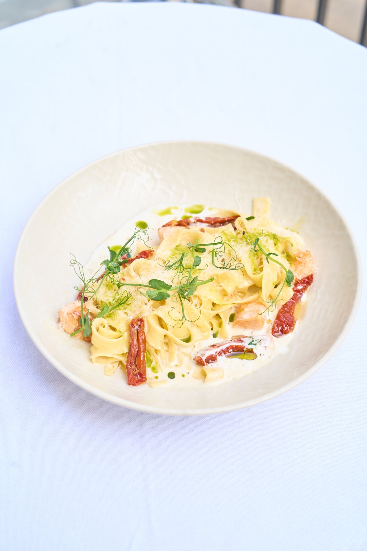 (паста фетучини, лосось, томаты вяленые, сливки, пармезан, чеснок)