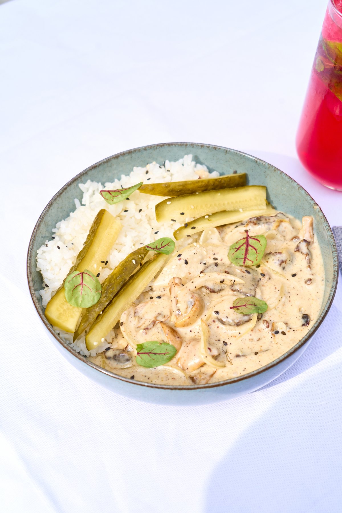 (говядина, лук, шампиньоны, сливки, картофельное пюре/рис)